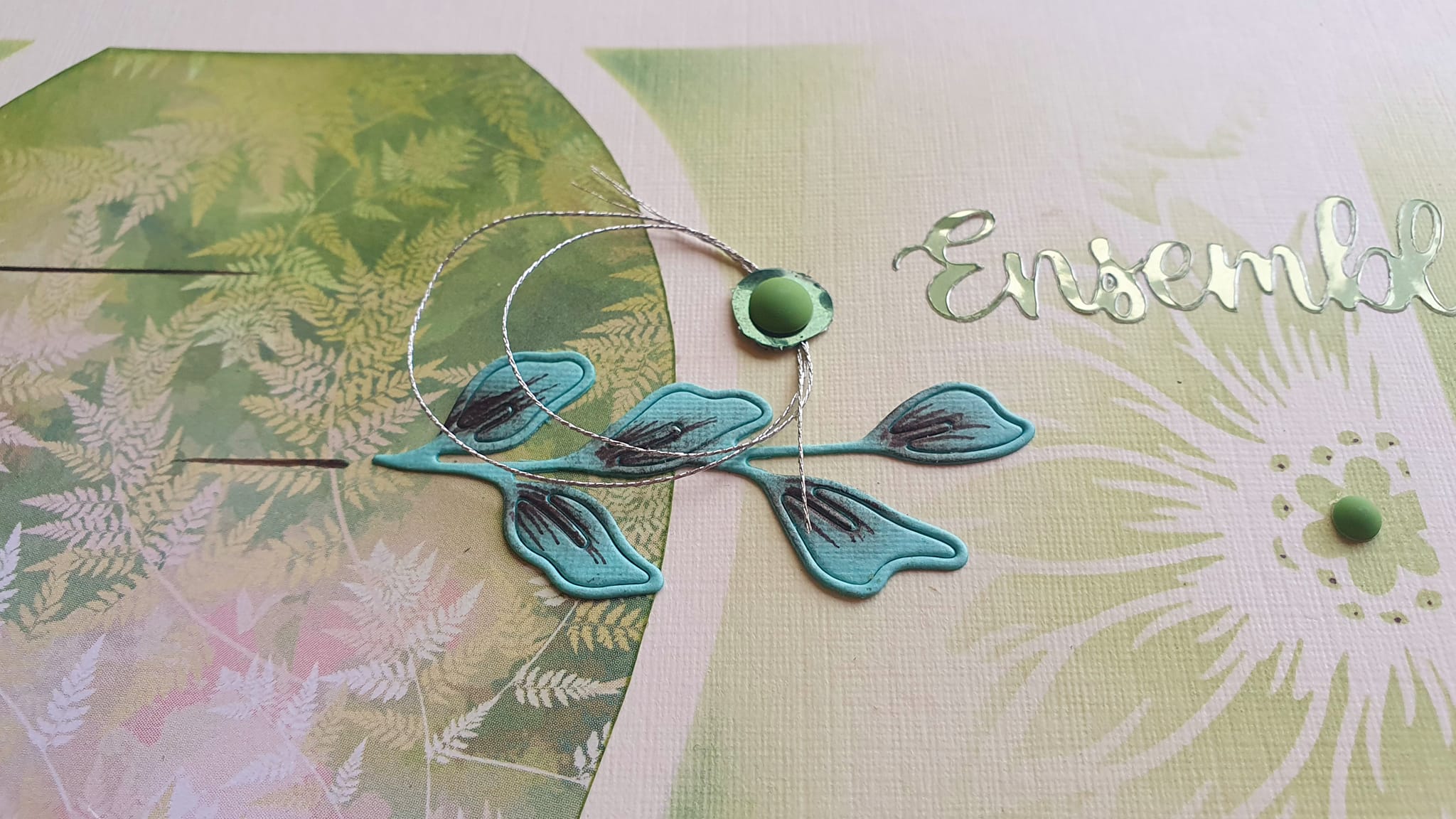 Note how the purple leaves have been cut in two different colours. I will often do this in my decorations as it highlights the actual die cut a little more and brings in a second colour. Note how Florence has inked the page with the decoration in place, then moved the decoration before sticking it to the page. This creates a lovely effect.