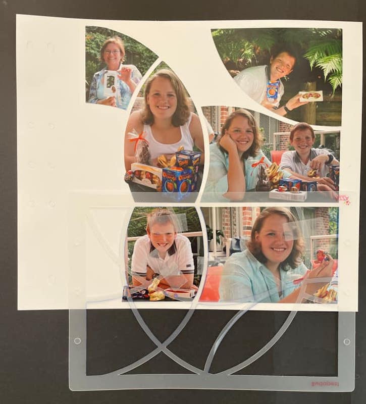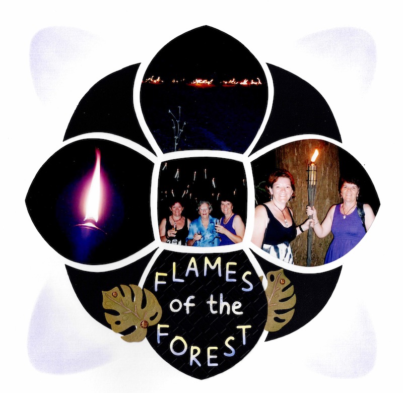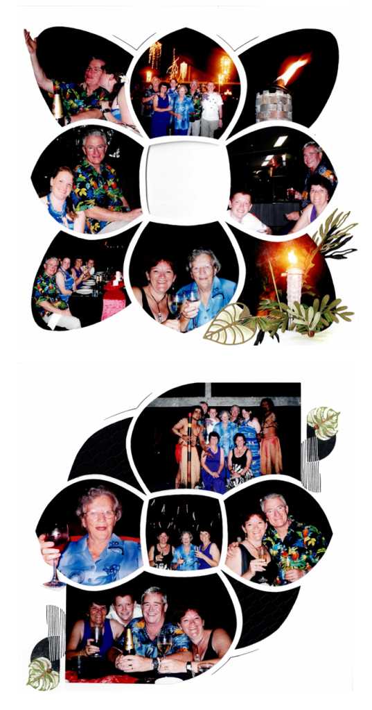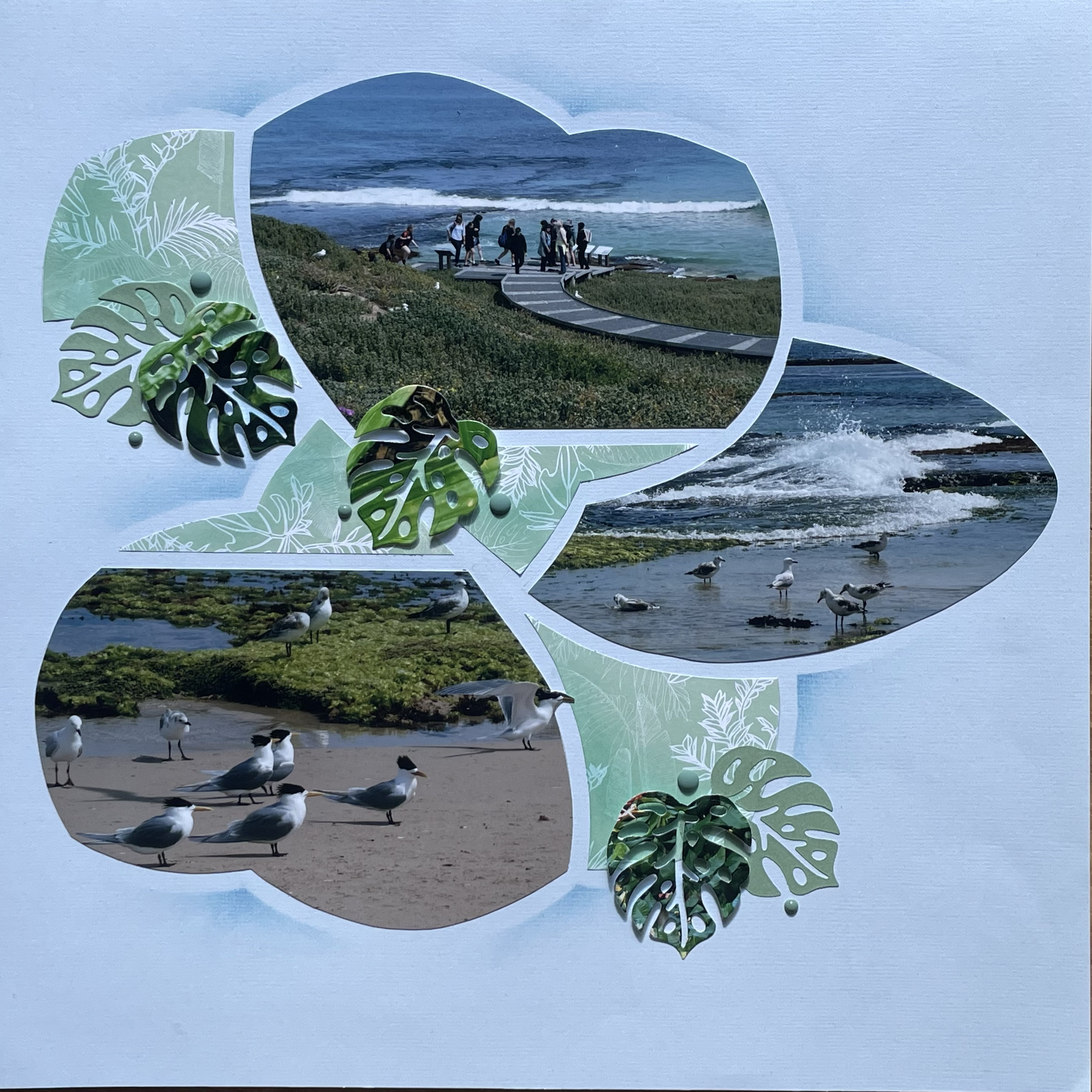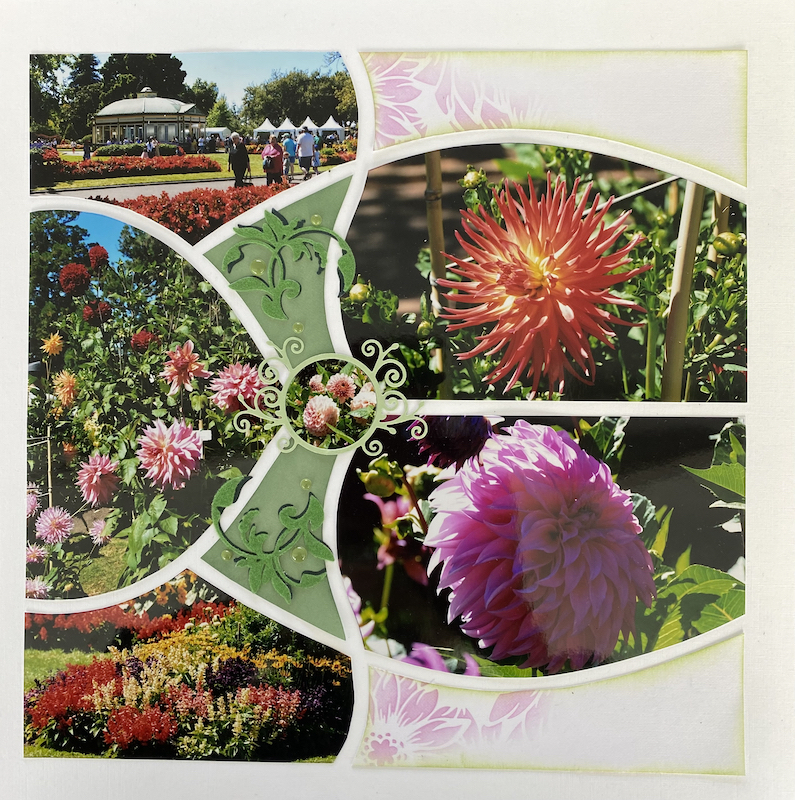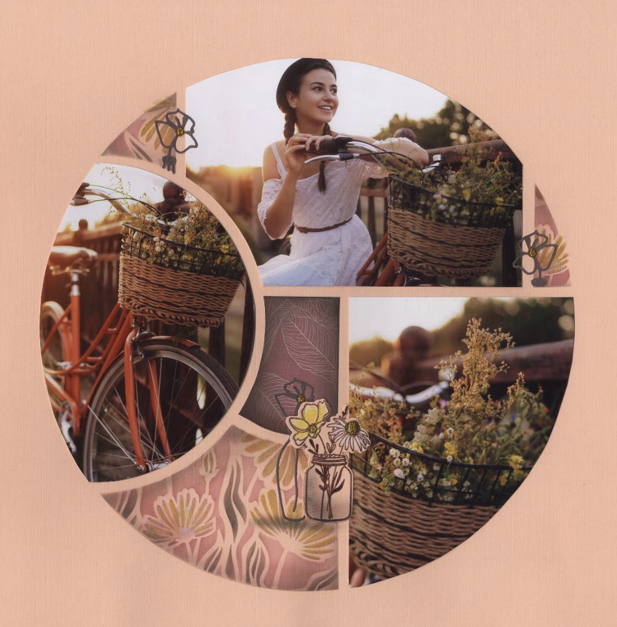For the layout above and below, the stencil was placed diagonally on the page. This allows for a landscape photo to fit into the ‘petal’ either on the left or the right of the page. You cannot use both sides, unless you crop the two landscape photos as Sue has done on the layout below.