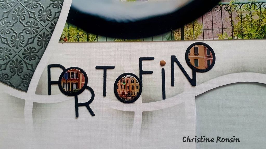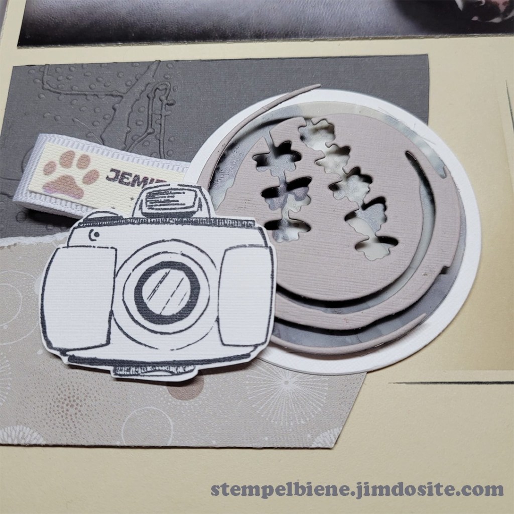 In the layout above Sabine has used the dies but has used them with the cut-outs facing downwards. This die can be used in any orientation. Note how she has used a piece of torn paper behind her decoration which joins the two pieces of grey embossed paper together. She has run a strip vertically behind her photos but in front of the paper cut-outs giving a lovely effect on the page. Washi tape, Glitter tape or strips of plain and patterned paper can be used. Lovely decoration ideas, thank you for sharing Sabine. In the close-up below you can see Sabine has used 3D mousse to lift the die cut off the page a little.