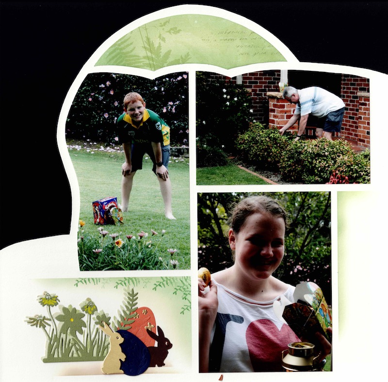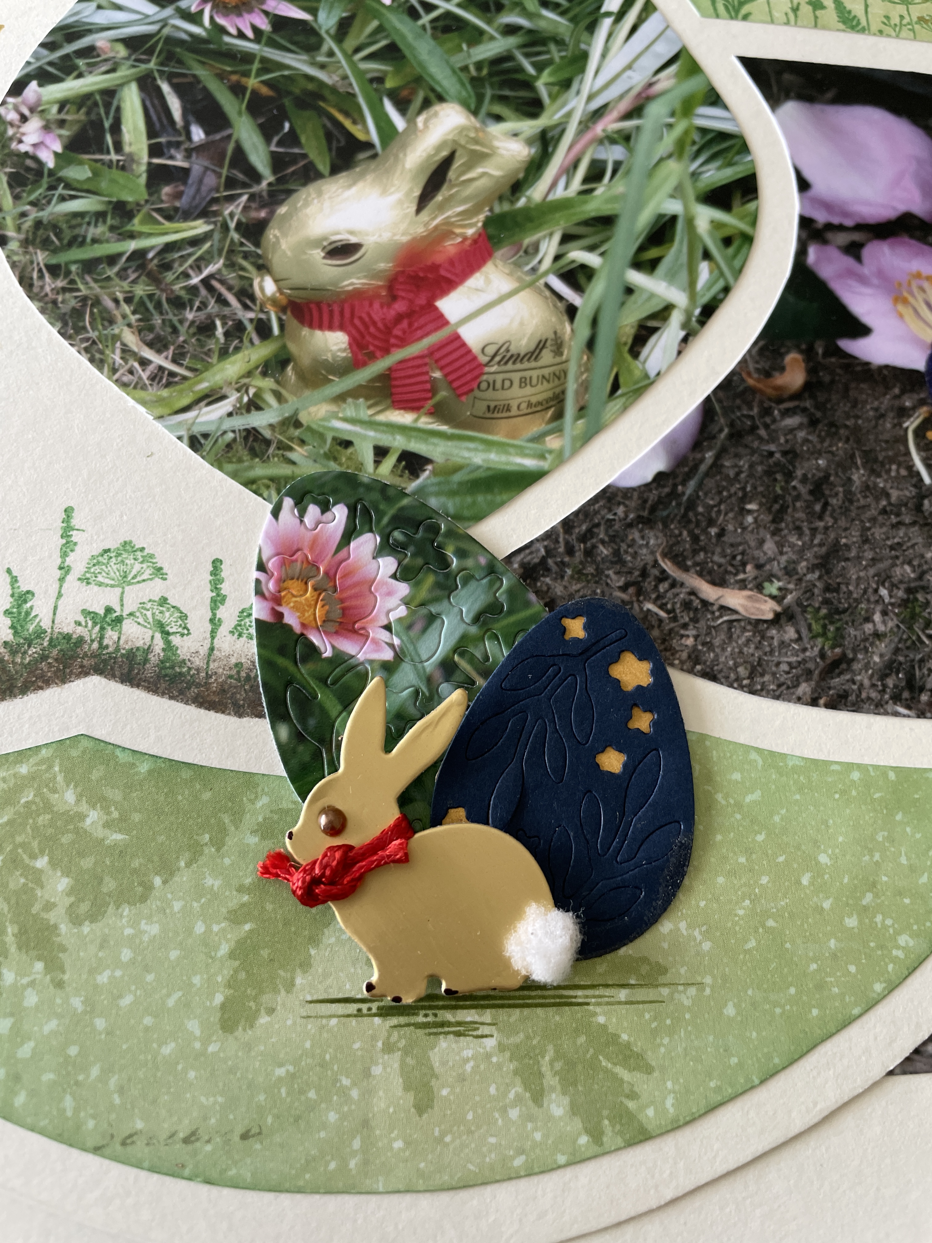 I loved this die and the Easter die that was released at the same time. I had fun creating a few Easter pages and created the page below using the AZZA Brooklyn stencil and the dies. I used a ‘pom pom’ for my bunny tail, a pom pom from the AZZA Pom Pom packets which I am sure you all have tucked away somewhere. This was a vertical double page, the two inside pages shown below.