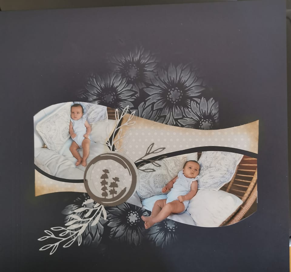 As you know, I am creating a 25 x 25 album for my sister-in-law so here is the page created with the new stencil. I used a normal 10 x 15cm photo for this layout.