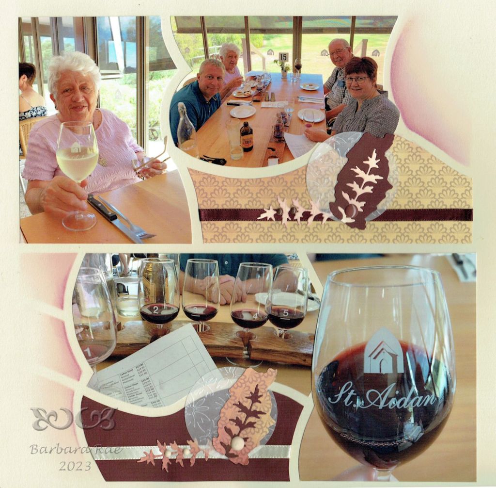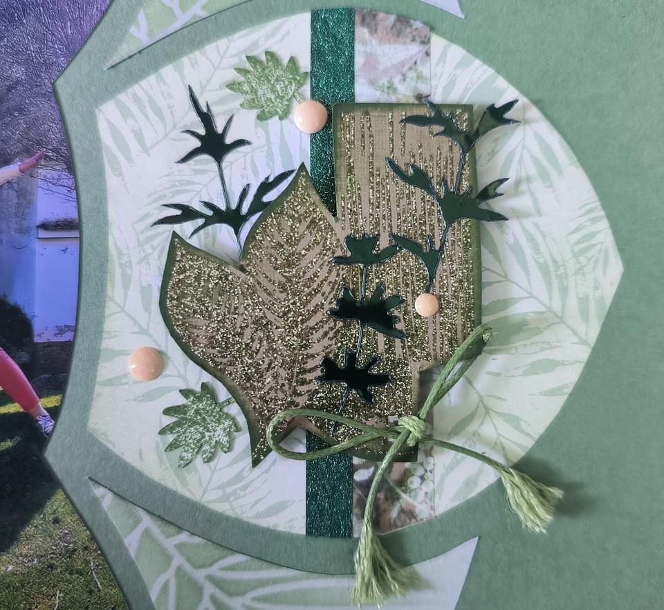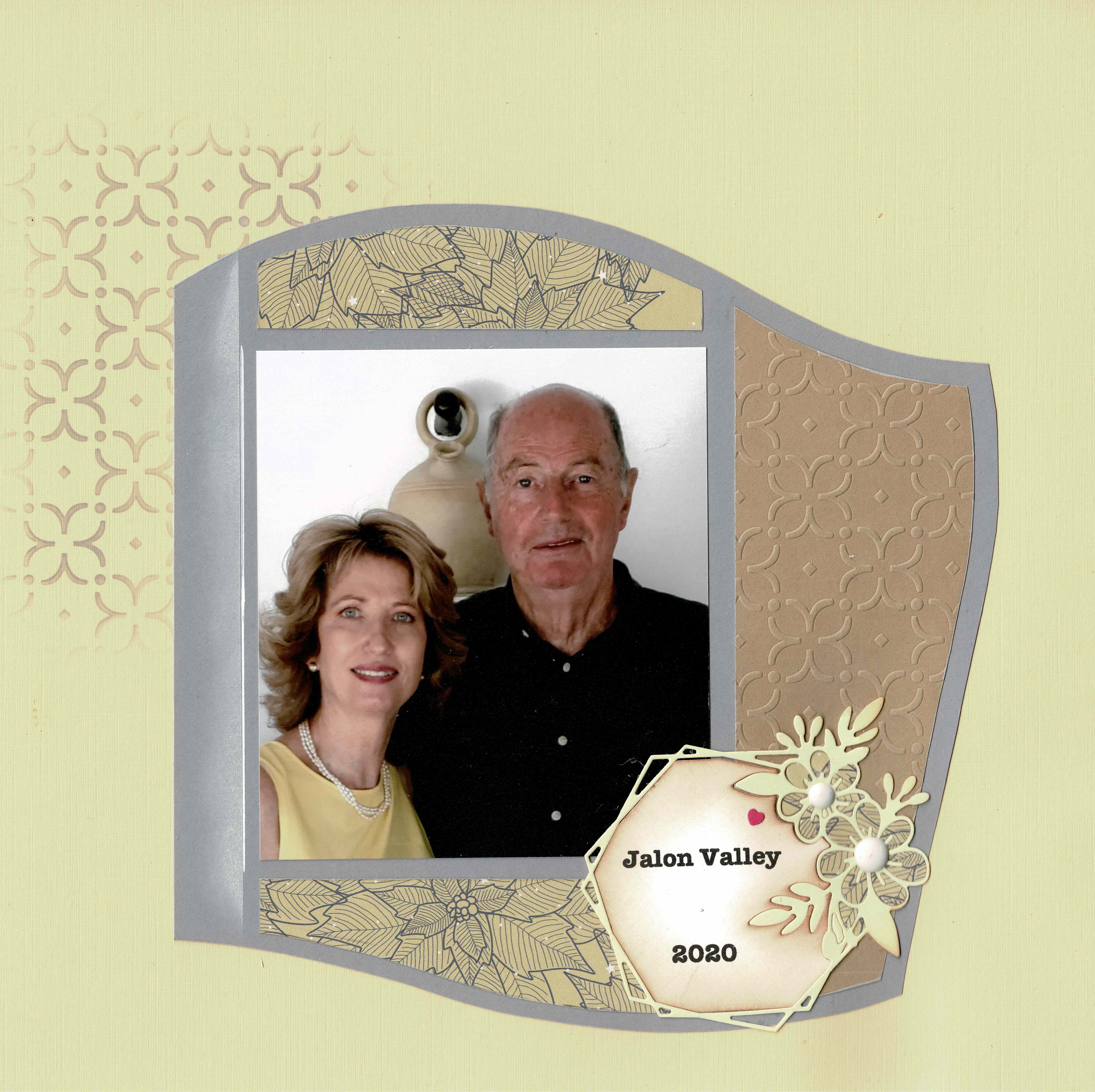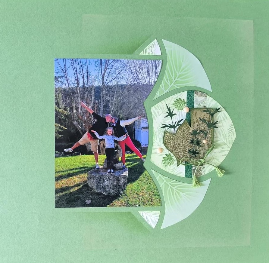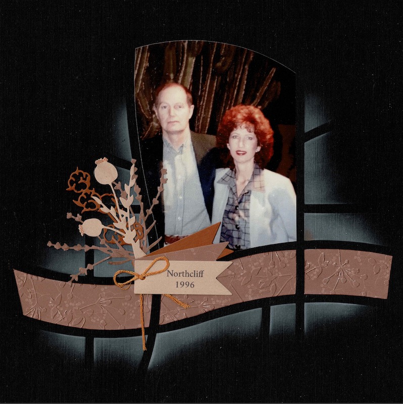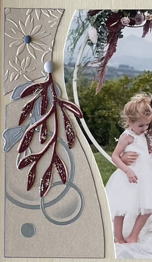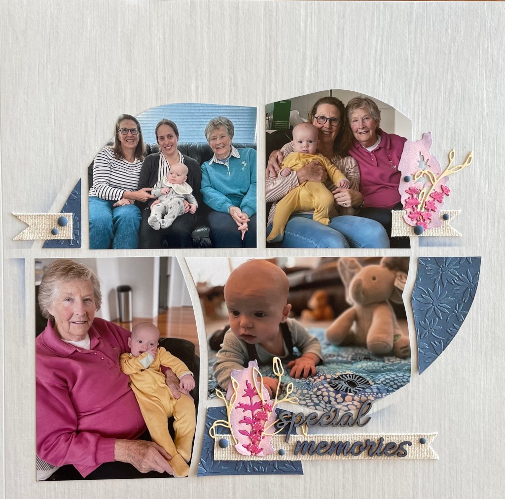 Sue Talbot brought in the older AZZA Lace decorations to pair up with the die cuts. The colours lend themselves to the photos on the page. The paper is ‘Floral’ with Sage green and burgundy tones on the other side.