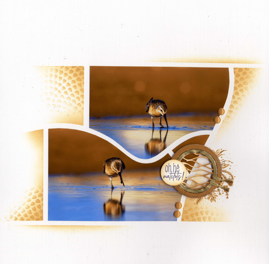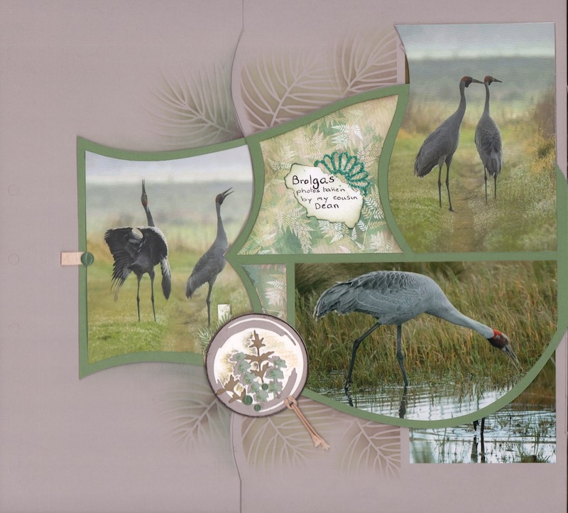 I used stencil 4 for both panes on the shorter side, just flipping it over. This always gives matching layouts. I did not crop the two photos at the top. For the decorations I used the beautiful Shadows patterned paper and the Australiana stamp and die set, colouring the image with my Aqua brush and inks.