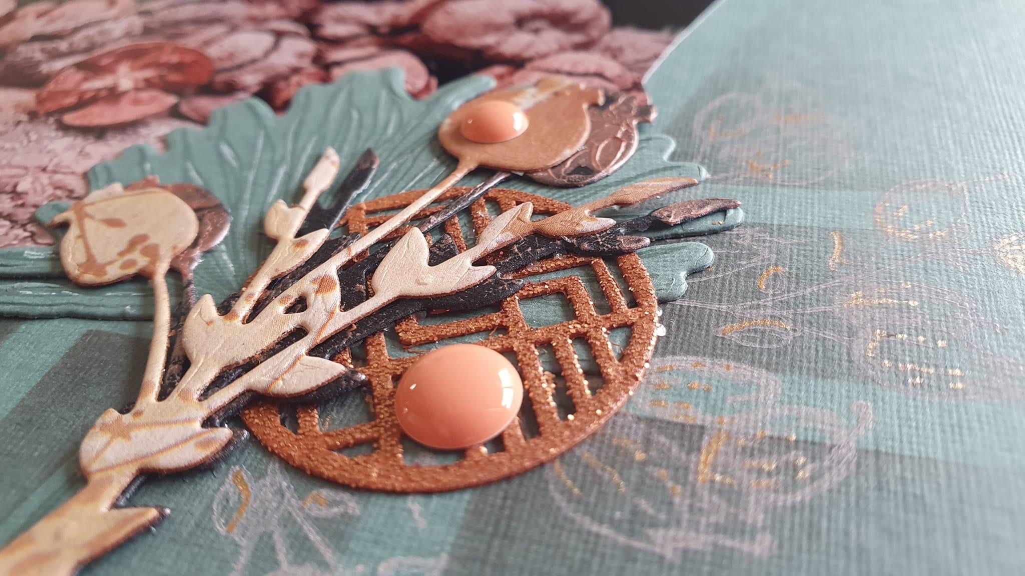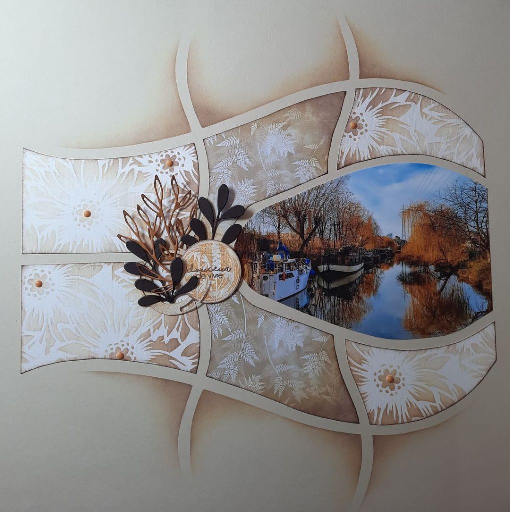 Another layout by Jocelyne in the Autumn tones, once again using the Glasgow stencil and the Shadows decoration products. She has used the Texture stencil combined with Resin dots, the beautiful patterned papers and the Shadows stamp and dies for the central decoration.