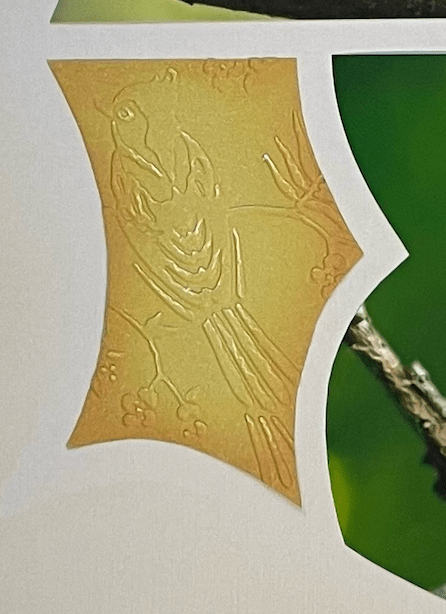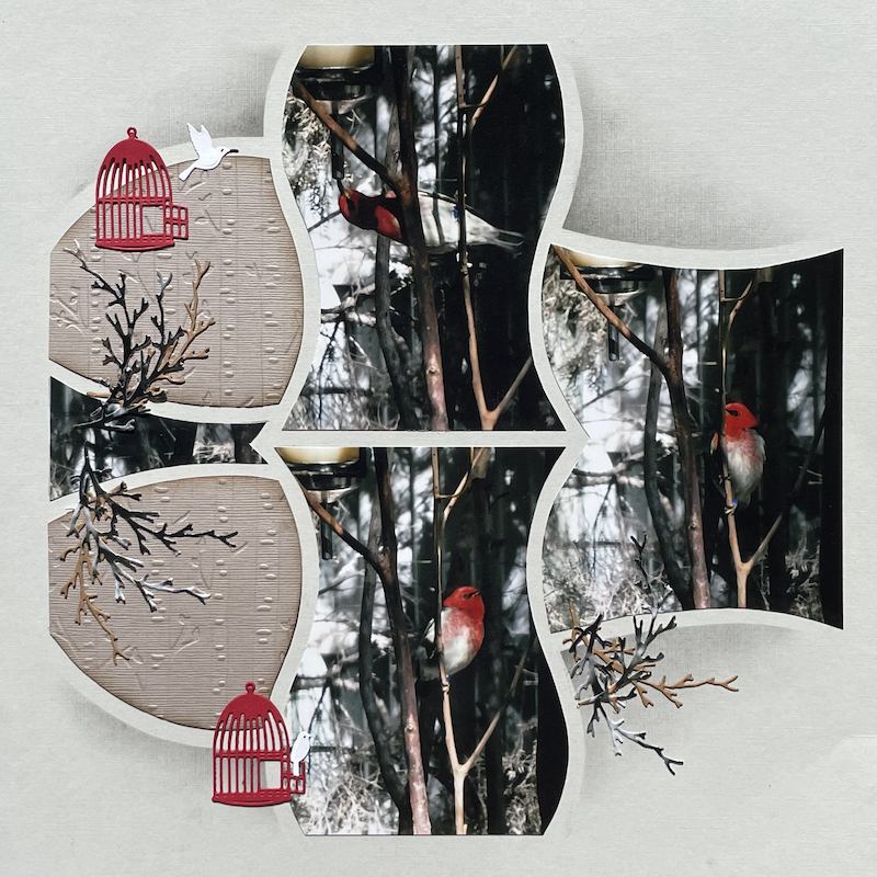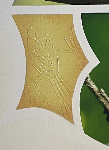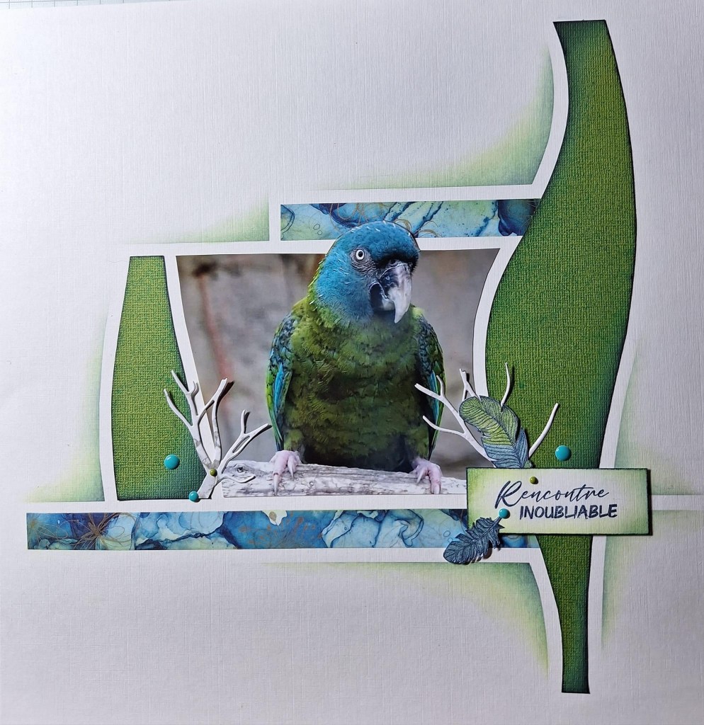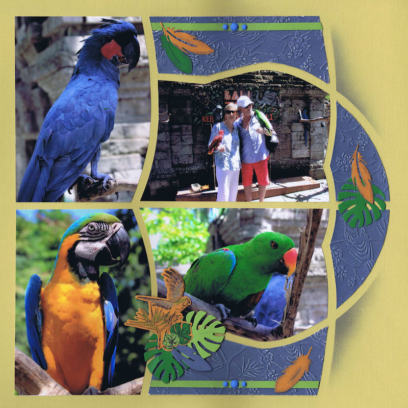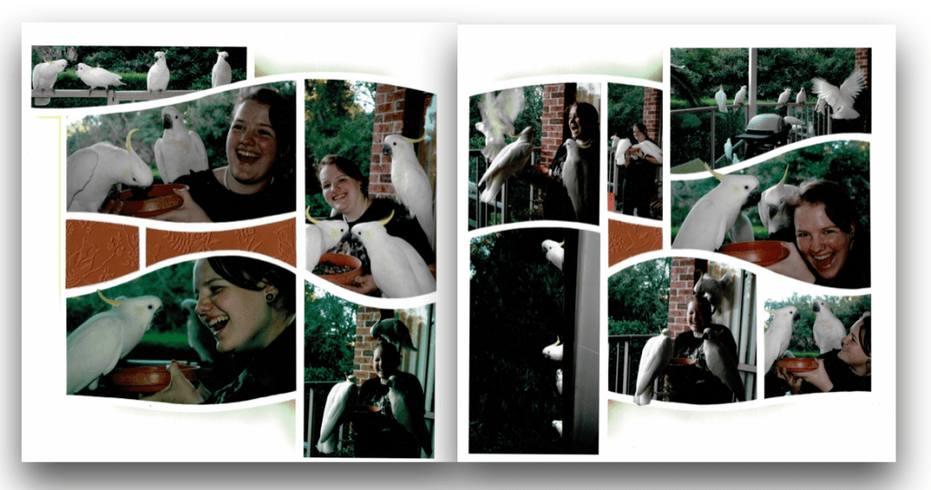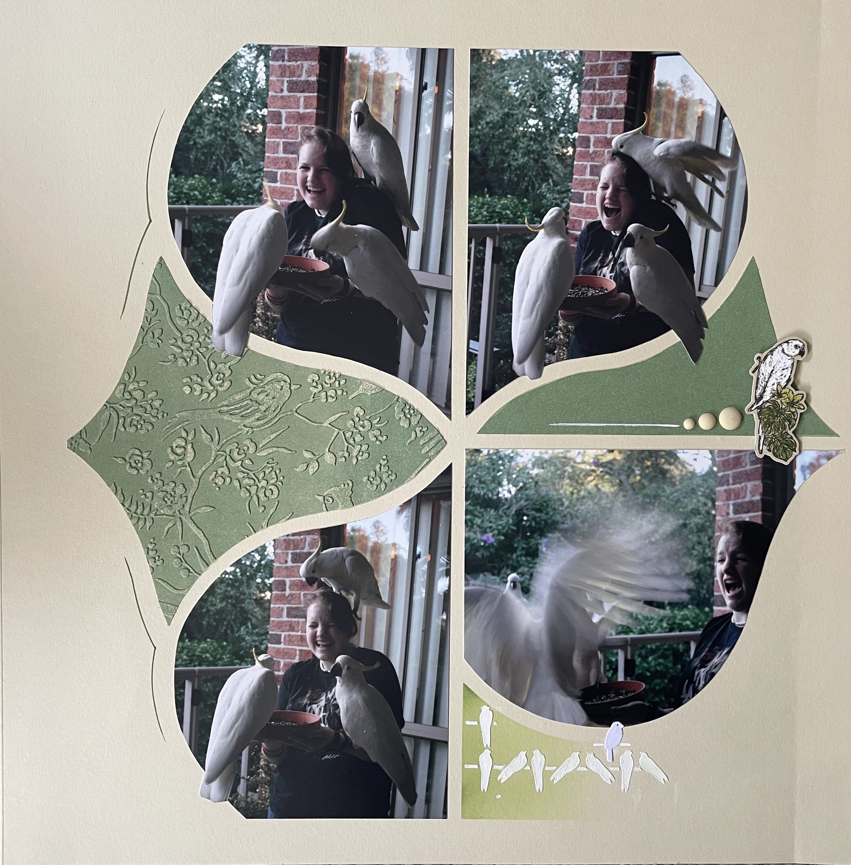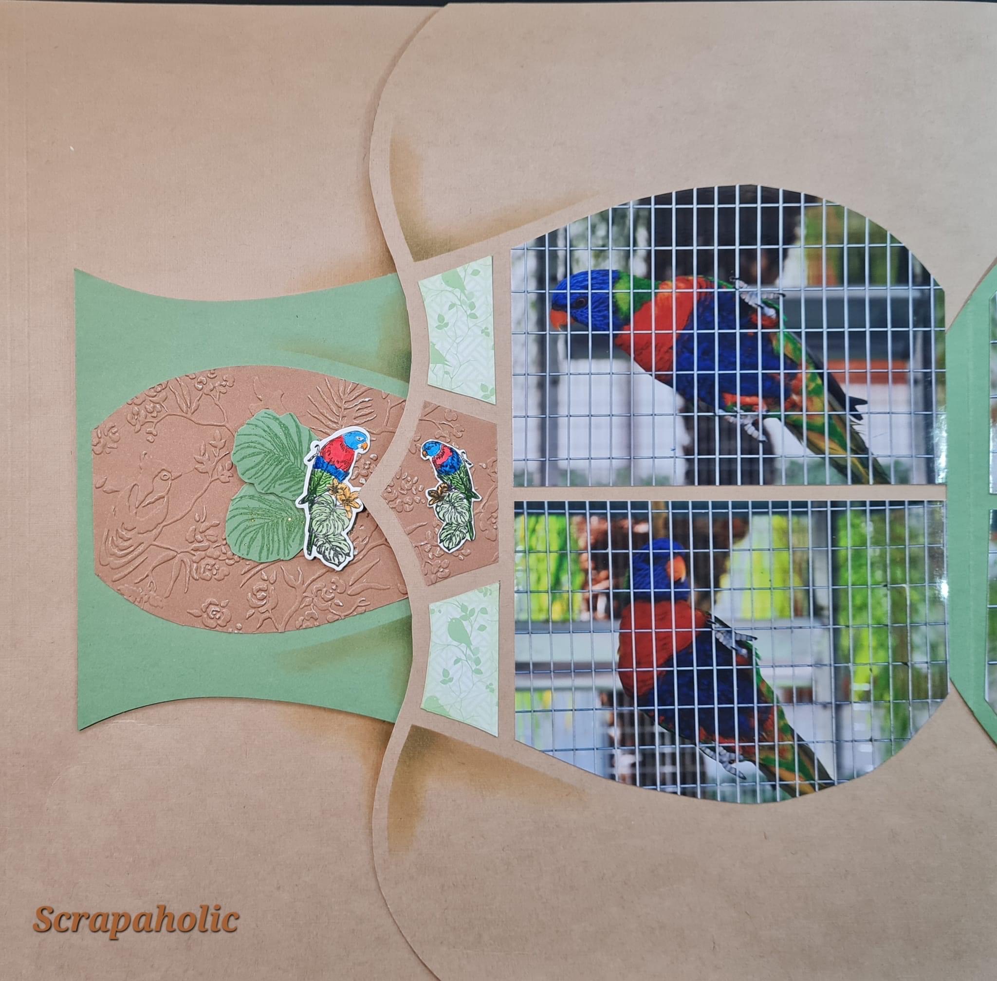These lovely Sulphur-crested cockatoos visited us daily in Sydney so the bird themed AZZA products released this month were perfect for me to get the photos into an album. The AZZA double page was ideal as I had so many photos, I created the layouts with the AZZA Himalaya stencil cutting the front page back along the lines of the stencil. I used the Beautiful Birds embossing folder in a few ways. On this front page I used an off-cut of the page for the embossing, but placed ink on the embossing folder (the new Prairie green) before putting it through the machine. With this folder do make sure you place your paper in your embossing folder to get the best images for your layout. I also embossed the small strip on the right of the page before using the Pretty Birds cutting die for the feathers.