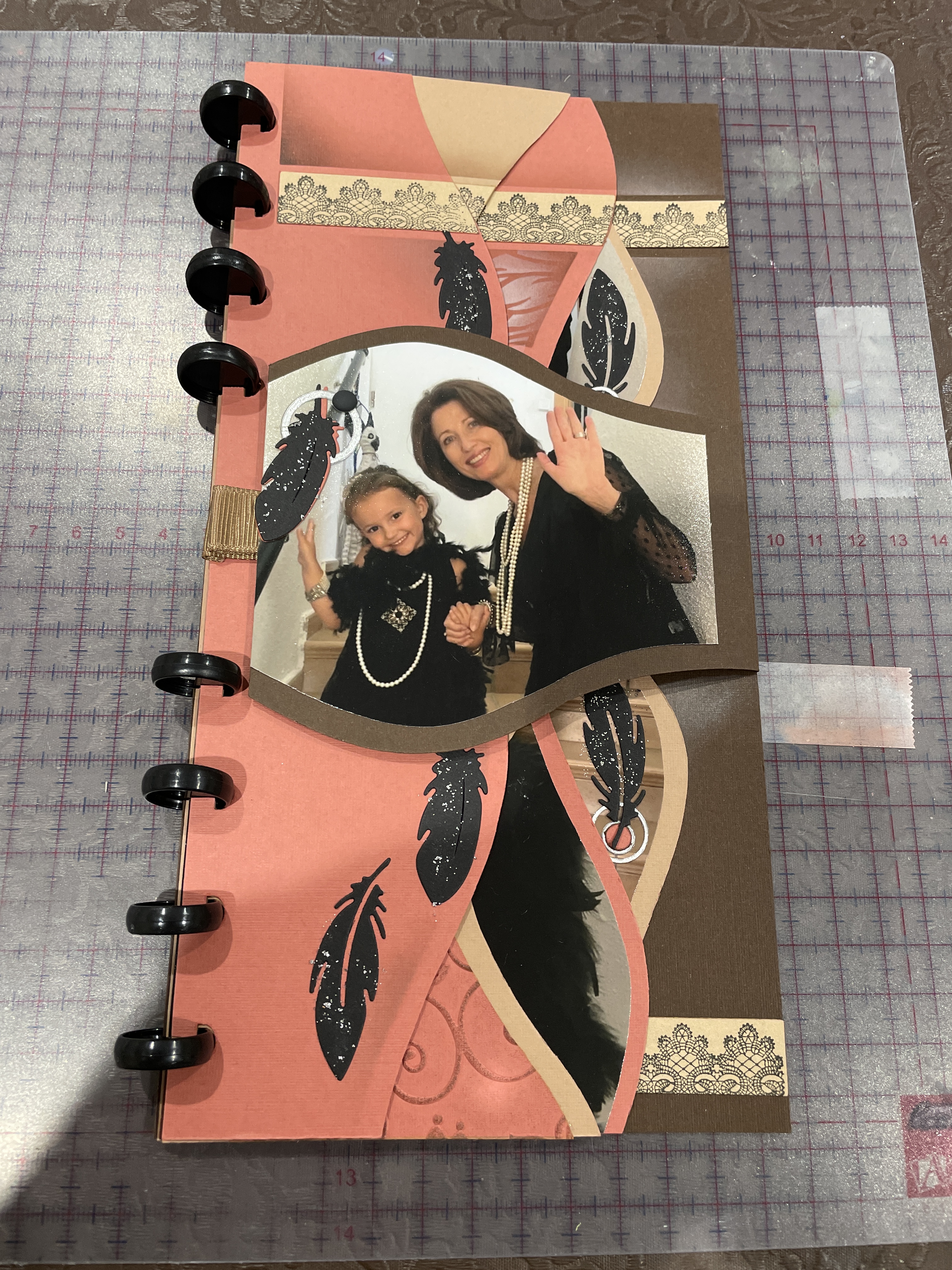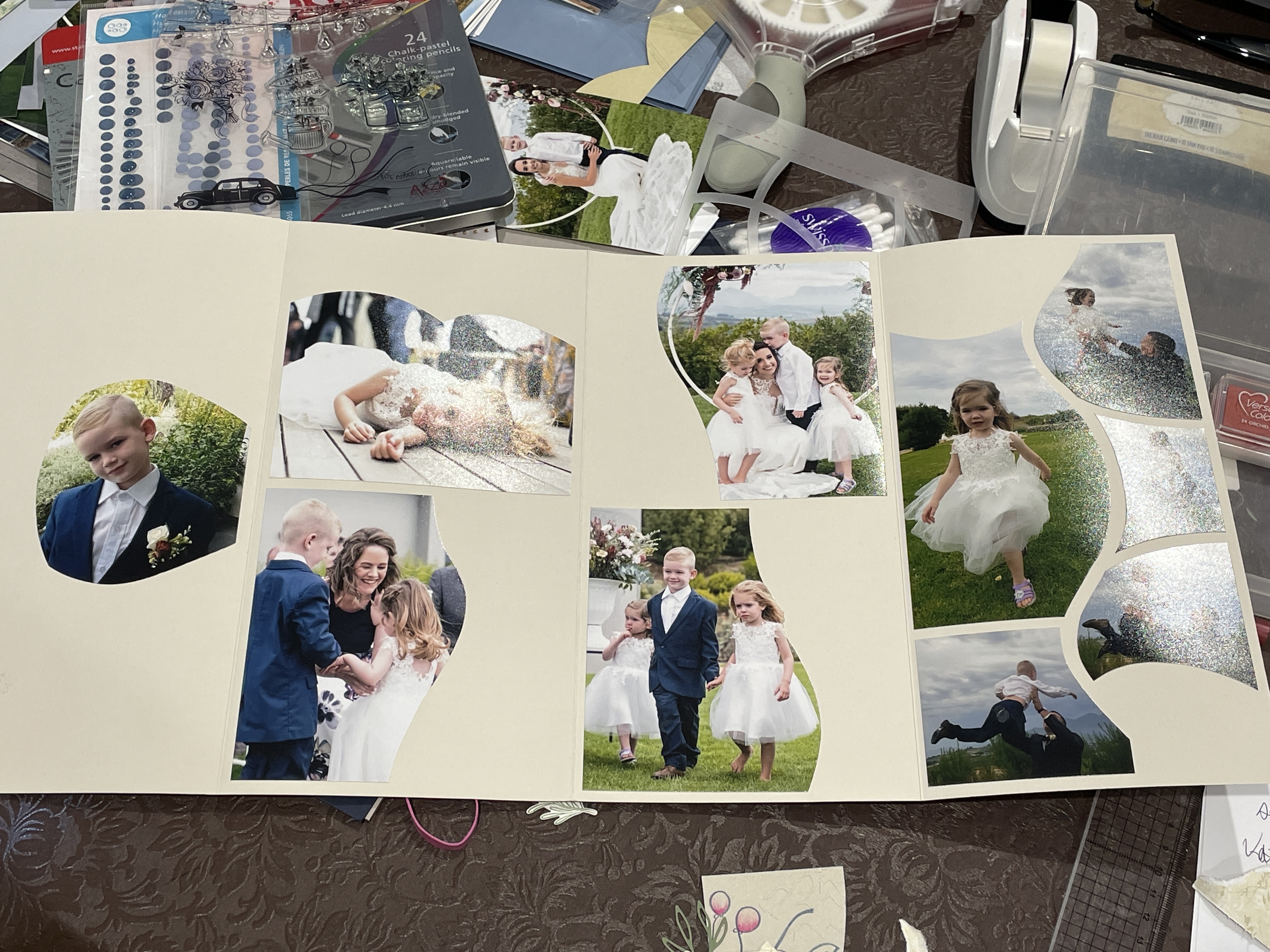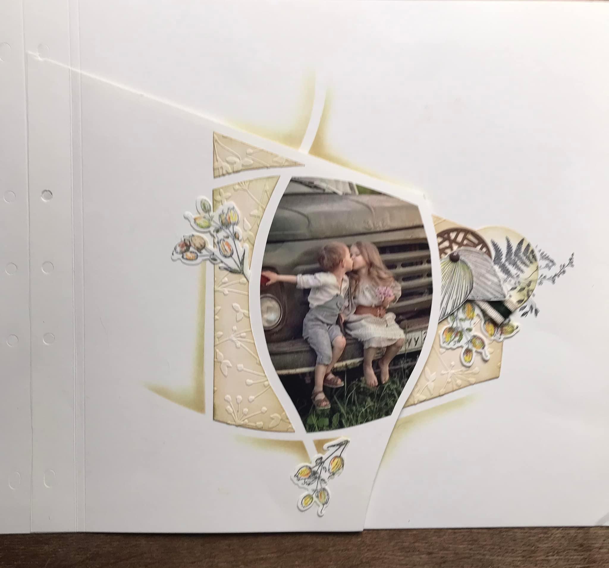 With this album you cut each page ensuring the following page sticks out behind it thereby showing part of the photos or decoration. I created 5 pages but more could be added. I only had a certain amount of photos to work with so added decoration to complete the look. The horizontal strip at the top of the mini album connects the pages together although not used on every page. I used a 2cm gap between inking and used the AZZA Stamp set Lace TAM 599, but the Lace die DIE 260 or Washi tape can be used for this too. I used the AZZA Shadows texture stencil and the Pretty Birds die for the feathers.