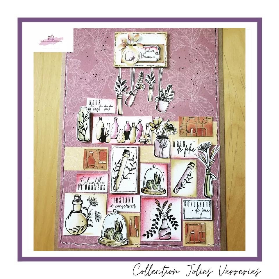 The Pretty Glassware products look so lovely on the page and can be used in so many ways. I love these two bright layouts by Valerie Guioc and Valerie Le Gros. Both Ladies used the Murano set of stencils for their layouts.