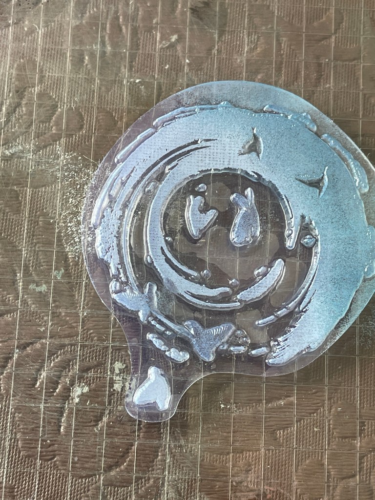 The decoration above has combined the stamped image from the large set of stamps: Shadows, a die cut from the die set above, AZZA sticker circle, glitter tape and a cut-out image from the embossing stamp.