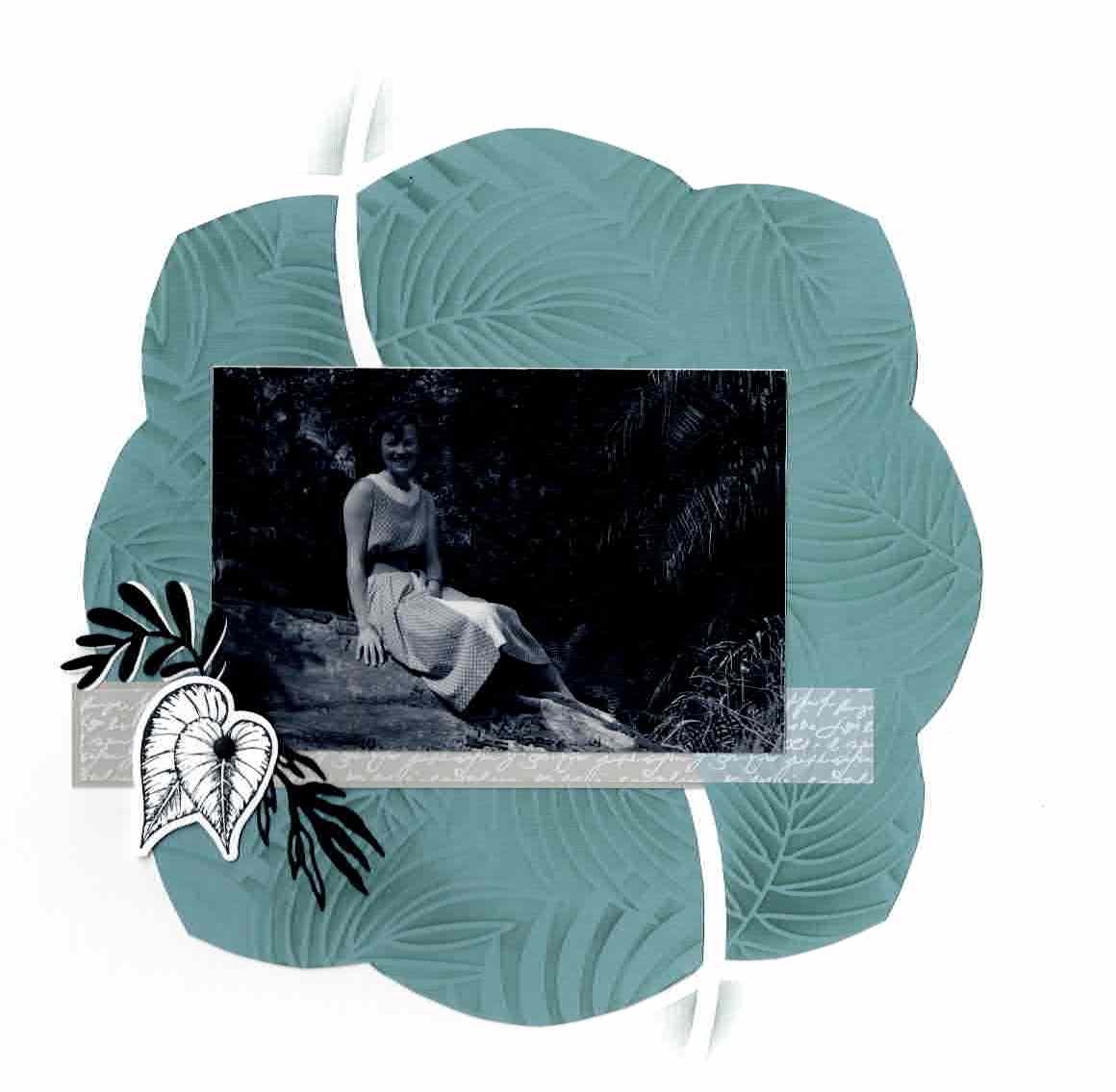 I love this layout by Sophie, created with the Bangkok stencil and Dried Flower decoration products. She has also used the Title Letters die set on the page. If you want to match the stickers in the decoration, use the edges of the sticker sheet to cut your letters or numbers as Sophie has done.
