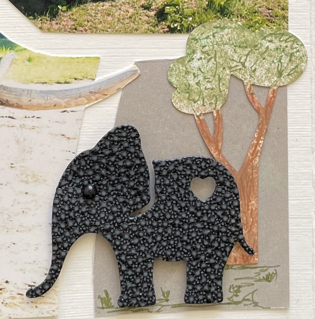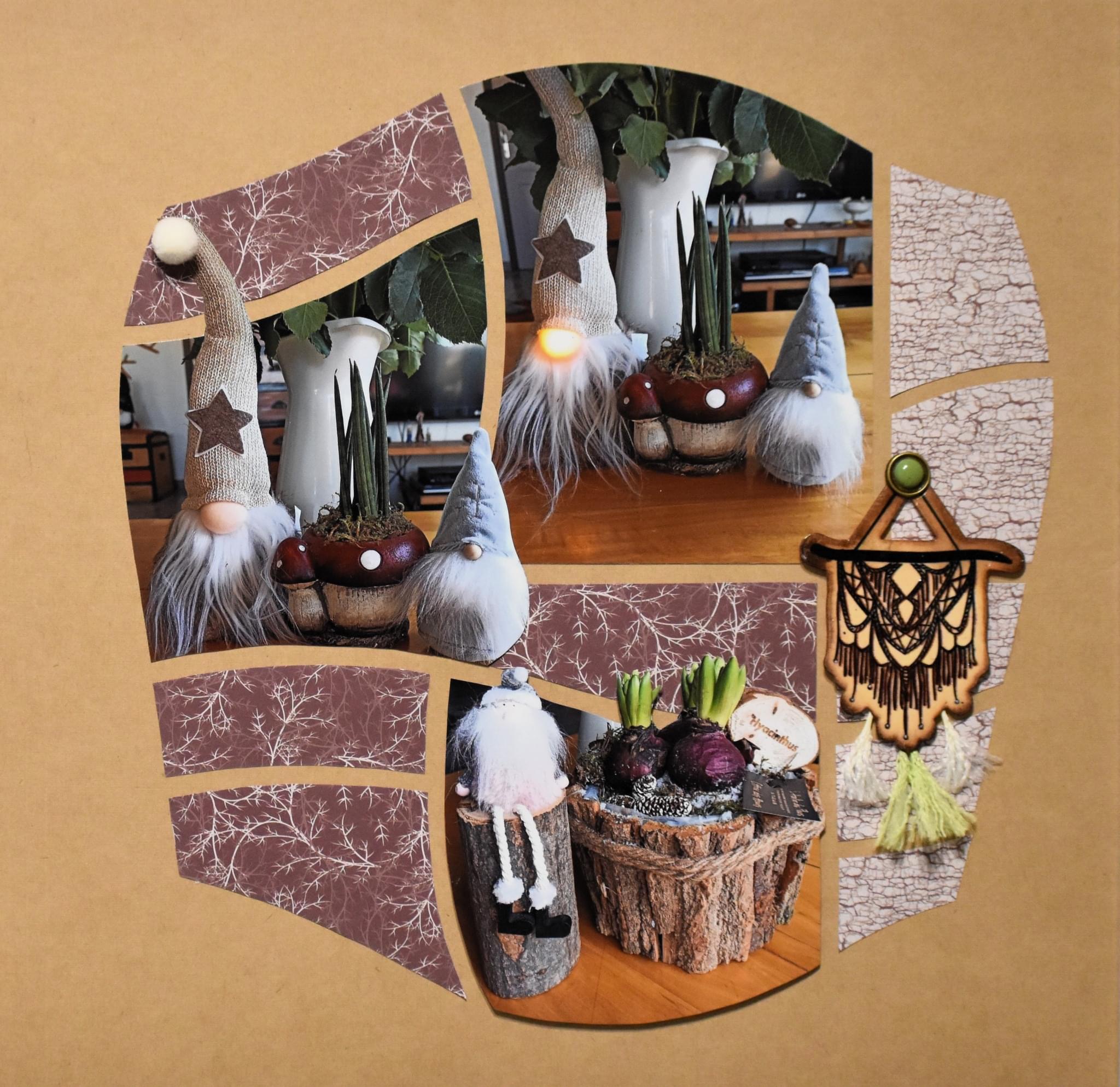 I coloured in the little gnomes to match the gnomes in the photos and created patterned paper stamping a sheet of AZZA patterned paper – Magic. I stamped two extra gnomes on white paper and coloured them in and placed them on top of two of the stamped images on the stamped patterned paper. This can be done with any of the AZZA stamps to create texture and a bit of fun on the page. The die I used was from the Ocean decoration product.