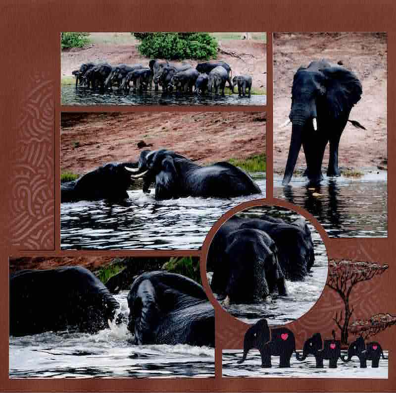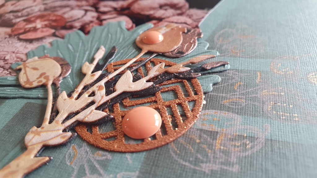 Again, this is a 25 x 25 album page. I used the lovely Bohemian Design and stamp and die set to finish off my decorations. The Bohemian papers are good to keep on hand, they have a ‘pink/brown’ side and a ‘yellow/brown’ side so will go with a wide range of decorations. They also look good with a little ink around the edges of the cut piece.