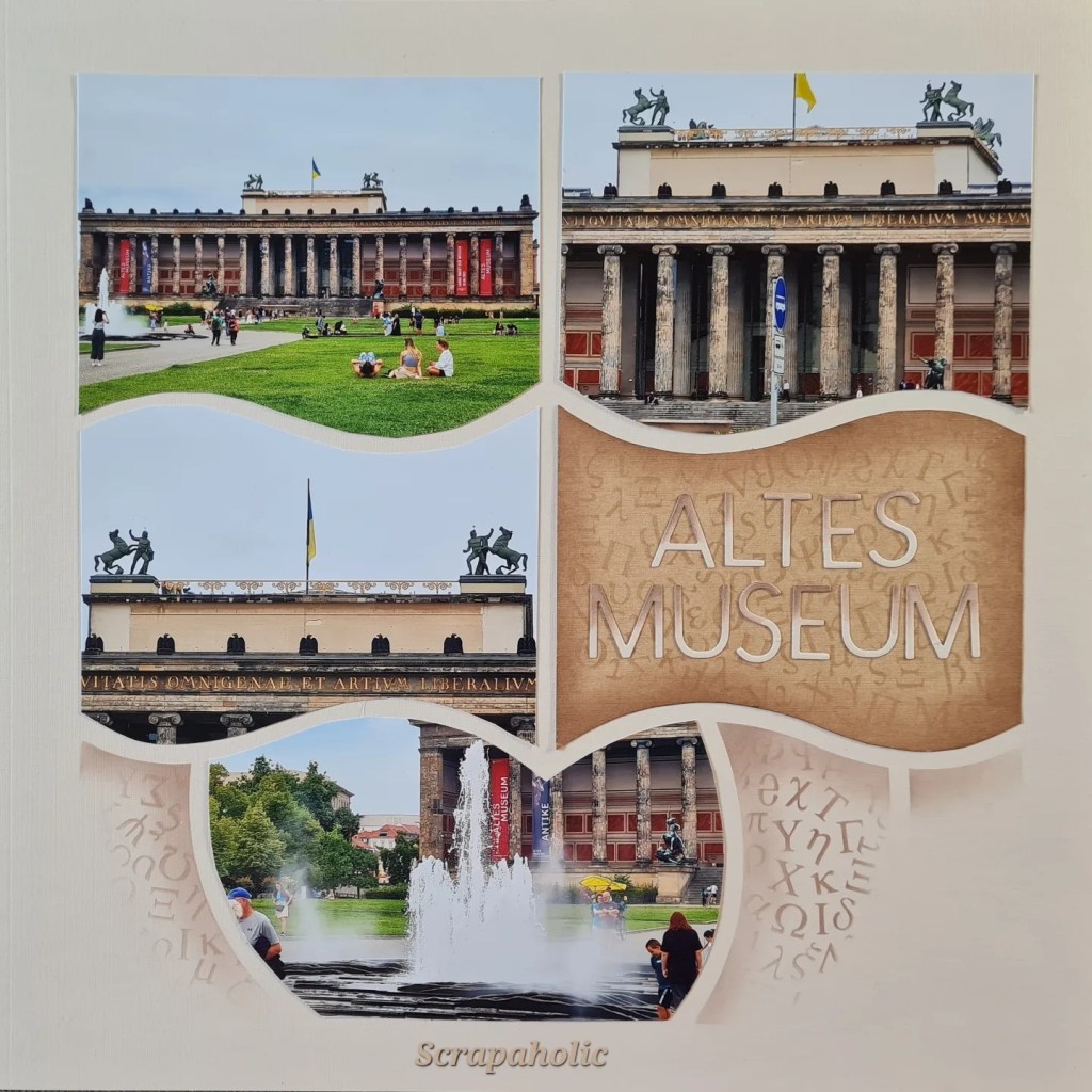 I created the double page layout below with the new Oatmeal colour page and the single AZZA Around the World stencil. The front page was cut along the lines of the stencil so the photos on the back page can be seen. I used the AZZA Sage cutting dies – DIE 163, for my title. The letters were cut out of off-cuts from the photos which is always great as the tones are then well matched. As a background for the title I used the Birds texture duo. The Photography embossing folder is very versatile and obviously will go with any theme. I completed the page with Resin dots and Linen ribbon. The paint brush images are from an older AZZA stamp set Art & Crafts, I also used the new stamp set Shadows.