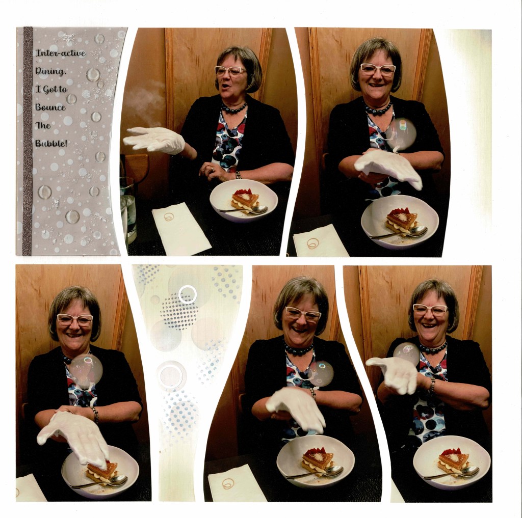 The following page was created by Jocelyne Heyne in Europe. Note how Jocelyne has used blue inks on the paper and the page to tone in with the photos. AZZA Resin dots always make lovely ‘bubbles’!