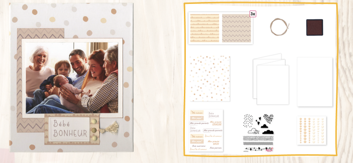 AZZA has also begun to release kits that contain all the products to create a mini album. The first kit is called BIRTH, but is really suitable to any theme. The kit contains the accordion sheet, covers, papers, Resin dots, AZZA cord, a mini ink pad and a stamp set. Unfortunately for us in Australia the sheet of words is in French, but there is enough in the kit to work with. It makes the perfect gift – with Mother’s Day around the corner now may be the time to order one. A few options in different colour schemes will be released over the coming months.