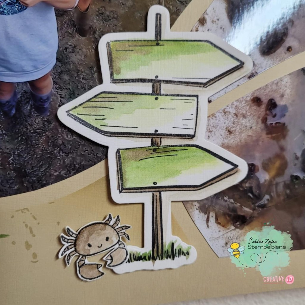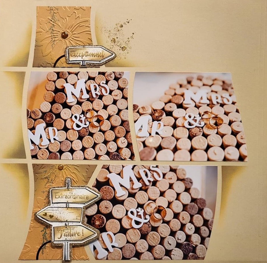 Lastly, another page for Michelle’s 25 x 25 album. I used the AZZA A4 Ocean stencil and the Panama and Linen Essential paper and double-sided colours. I completed the page with Resin dots, the wider Chocolate ribbon and a little twine attached to the stamped sign image. I do love these Sign stamp and die sets.