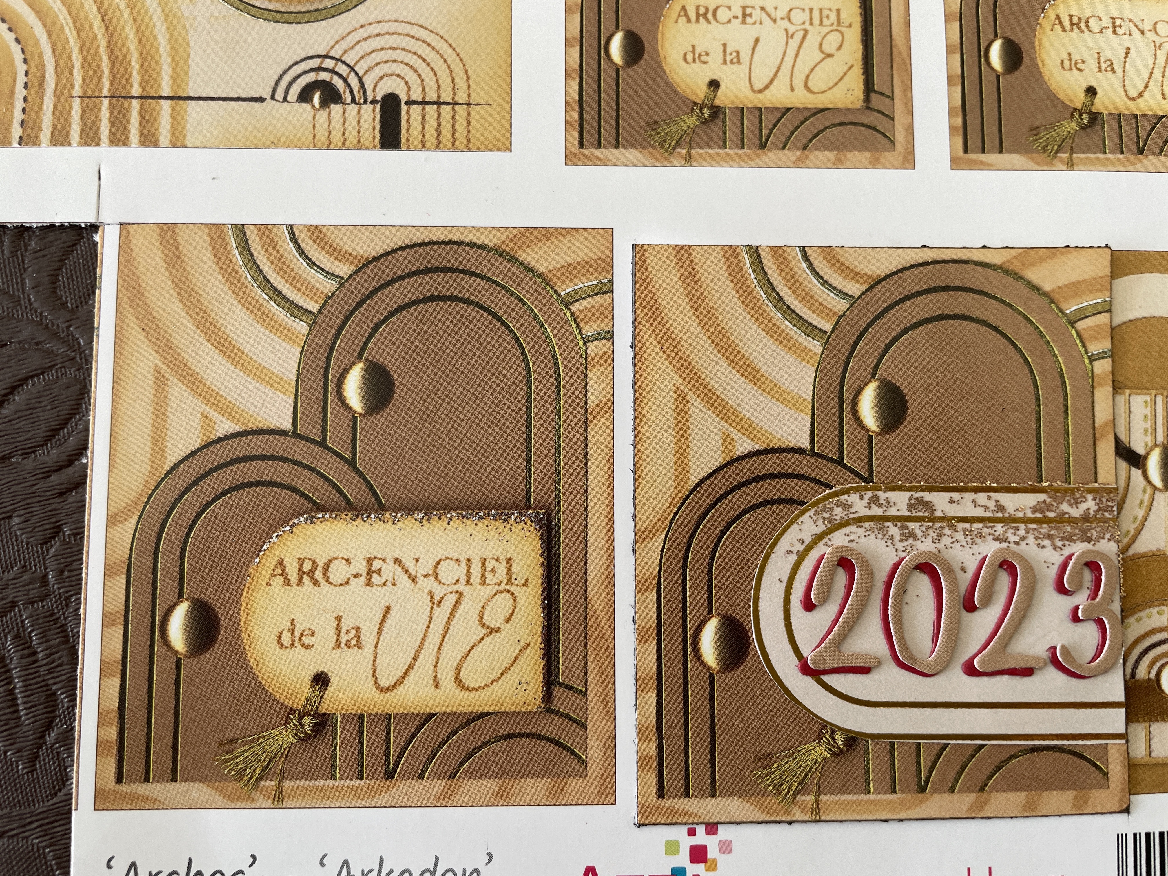 Although there is French writing on some of the Sketch sheet images, this is easily covered up if you do not want to see it on your layout as show below. I covered the writing using the Arches concentric dies and a little of the gold cord. I also used a Sticker circle to continue the circle in the design on the first one. On the second I used the patterned paper and iZink glitter paste.
