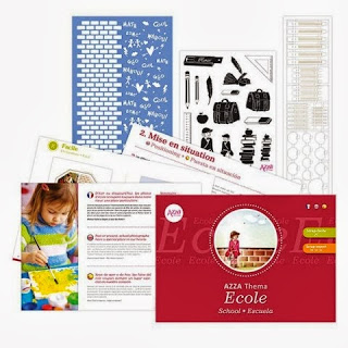 Theme kits will be released every two months. As Europe are going back to school, this months Theme is ‘School’. The kit comes with an instruction booklet (French, English and Spanish), a set of stamps, a texture stencil and a sheet of lace figurines.