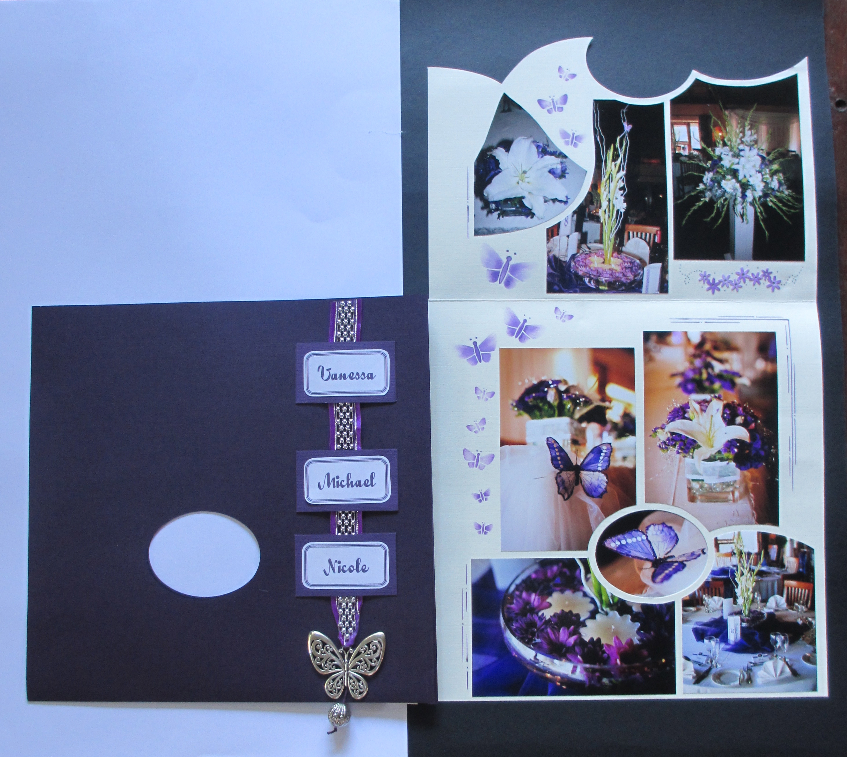 Once you have opened both flaps to see the first page and the photos on the inside of the flap, you close the purple flat and turn the page over – showing the full cream page with the cream flap remaining open.