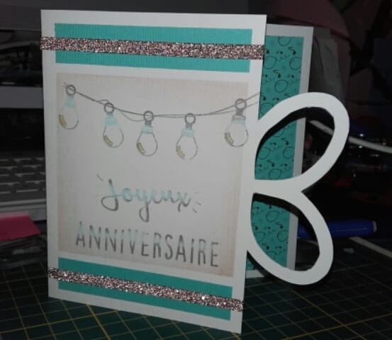 Here is a card created with the paper and the cutting die shown above. The die cut has been foiled.