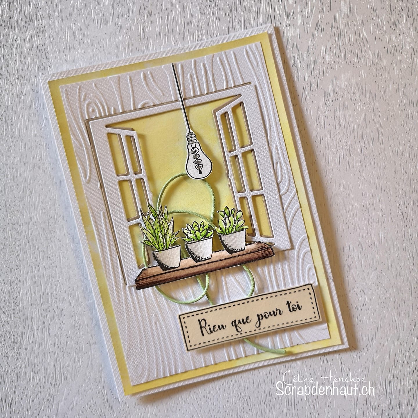 The card above is one of my favourites. A beautiful, simple design with any message placed on top of the ‘Sewn Squares’ Frames. Honorine has used the AZZA ‘Sewn Squares’ cutting die, AZZA Texture stencil with inks, AZZA Cord and an AZZA stamped image. Similar products have been used on the card below.