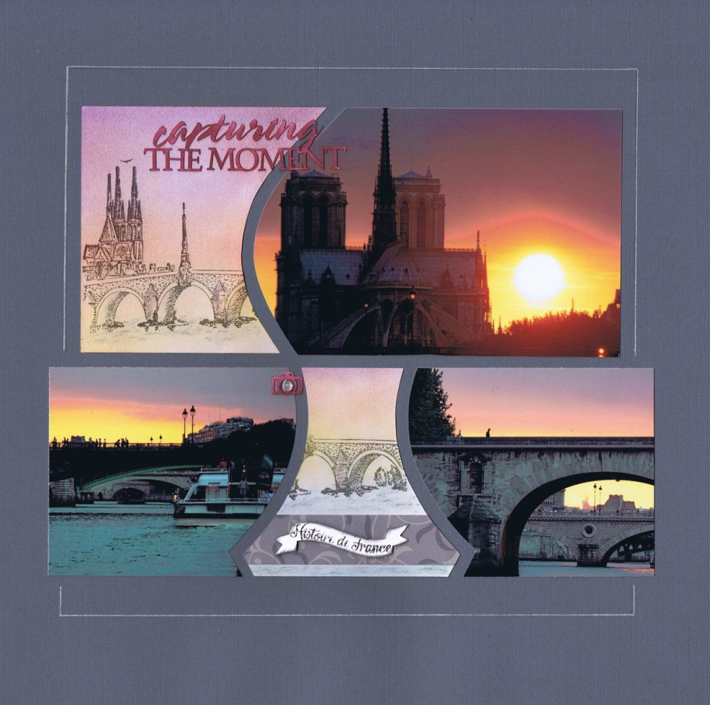 The beautiful LOIRE stamp is a must if you are a regular visitor to Europe and love to explore the history. Note how Deb has used the same stamp twice – using only part of it in her smaller ‘space’. She has chalked the papers beautifully to match the tones in her photographs.