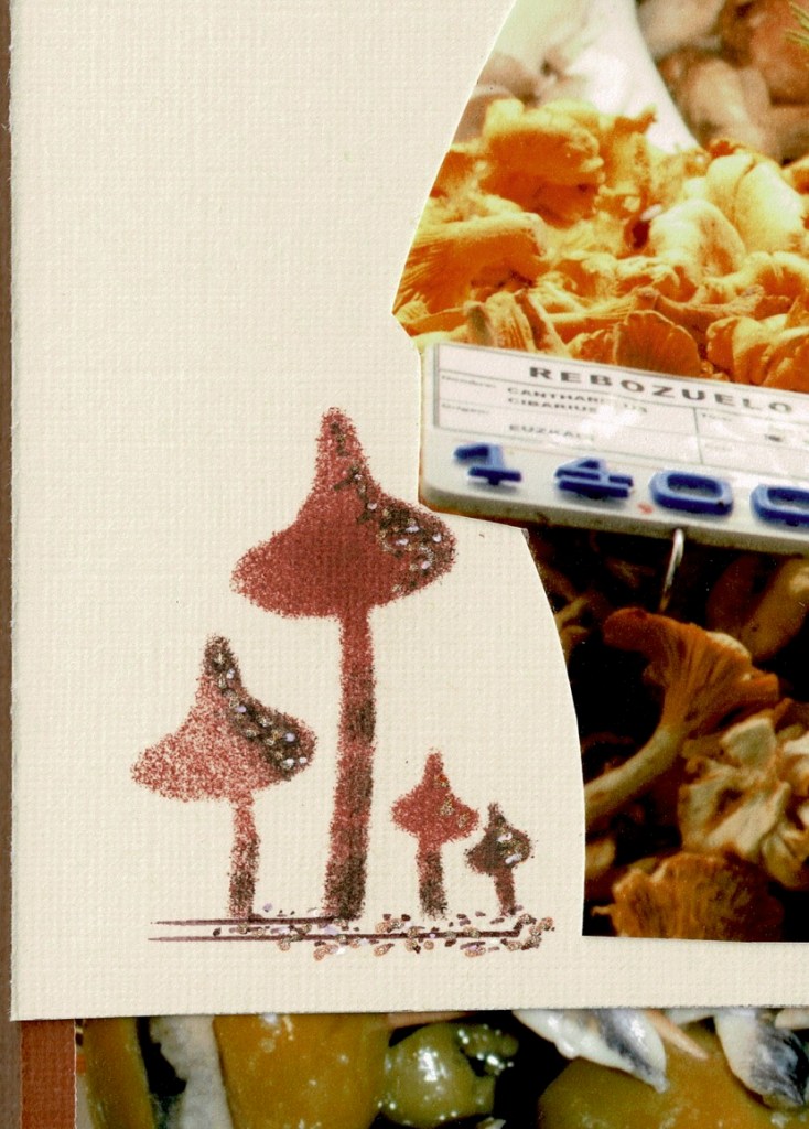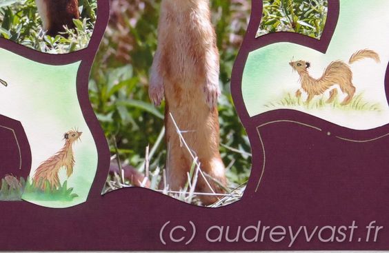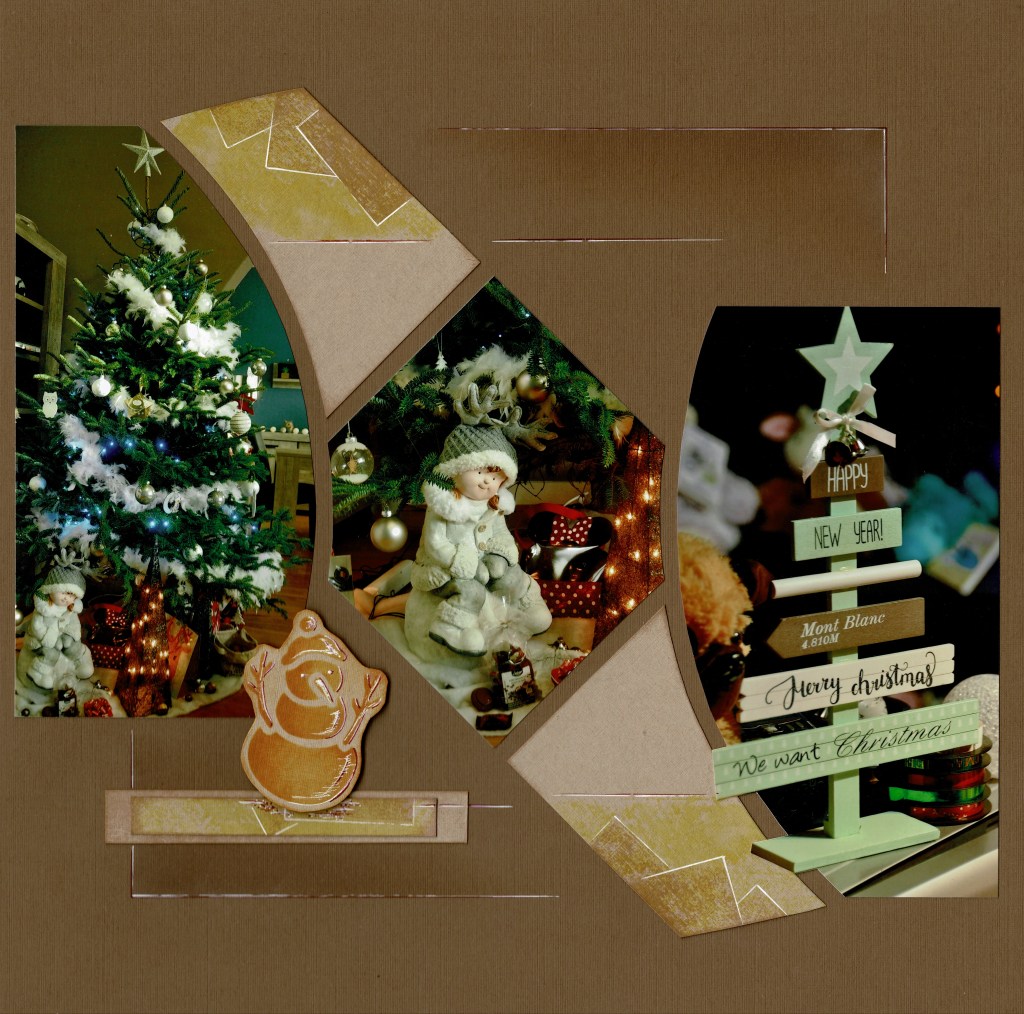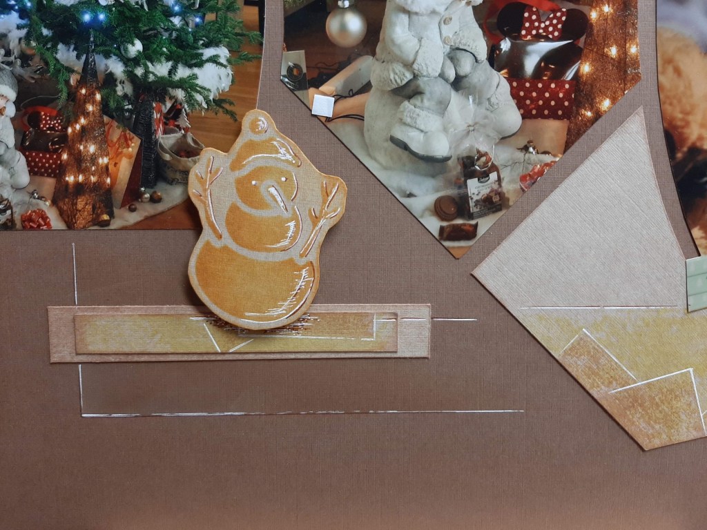 This time Christine has used a single colour in different tones and brought it to life with pens. Note how he has been grounded on two strips of paper, the top decorated in the same way as the rest of the paper cut outs on the page.