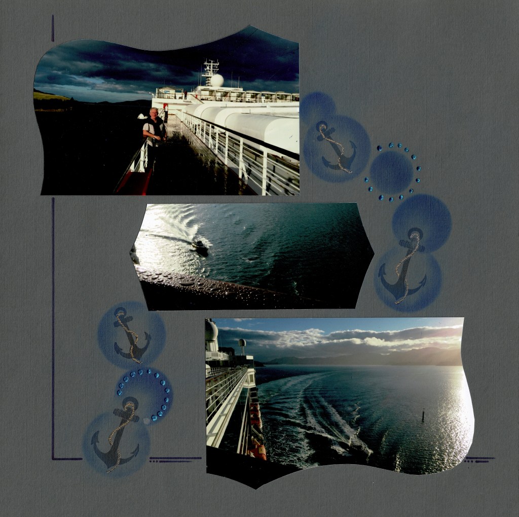 This is one of my favourite pages in the album. I have used the decoration stencil on both paper and the page itself. I have also used an image inked onto a circle cut from AZZA cork.
