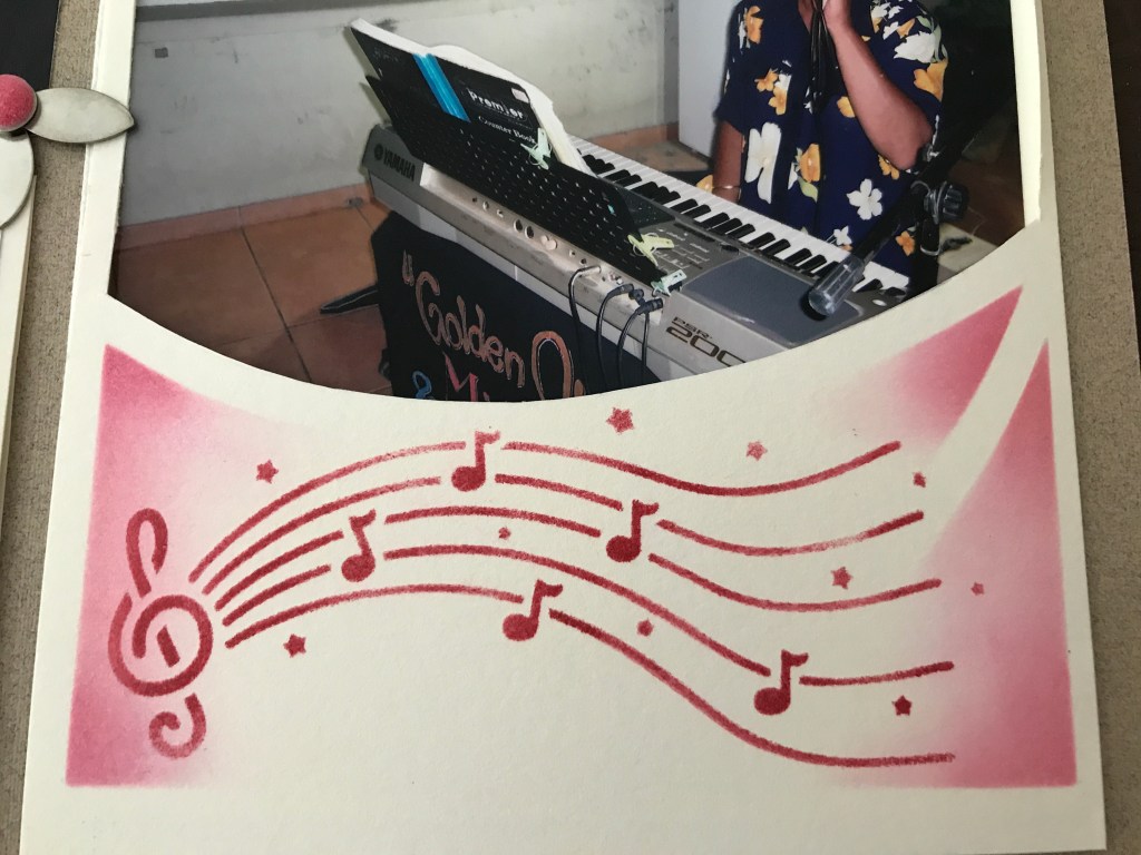 Although this is a Christmas stencil – I love the music on it. Here I have used it on an Accordion sheet on a page – very quick! I inked a background for it to sit upon with inks and a sponge then inked the decoration stencil with an AZZA dauber and made sure it was dark in some places and lighter in others to give it a little character.