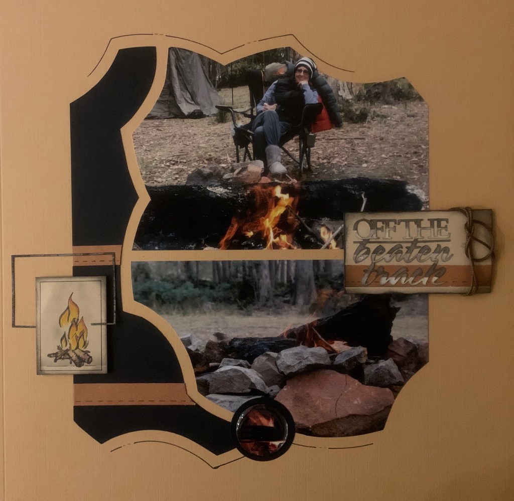 Deb created a lovely page using the Loire stencil and Camping stamp set for the fire. She has used one of the AZZA Australian phrases and has used the frame, cut off the phrase, in conjunction with her decoration on the other side of the page. She has finished off her page with a Resin pellet to highlight a small round photo and a little AZZA Cord.