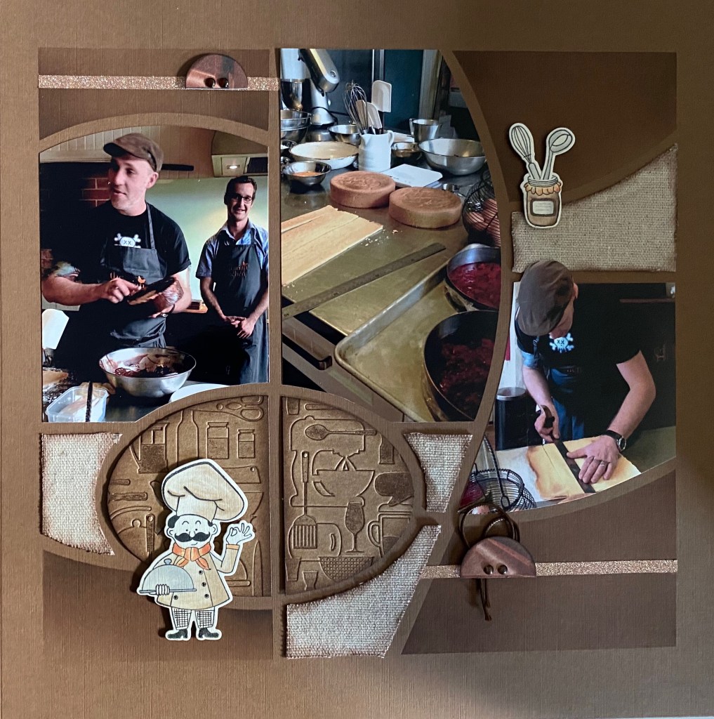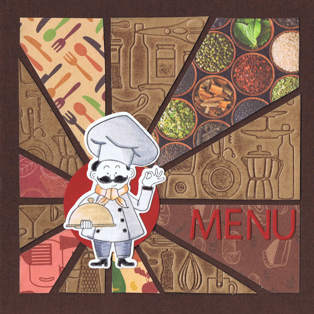 Isolation baking on the page above – don’t you love it!! The Embossing folder is stunning on the page. The Chef can be coloured in to suit your page.
