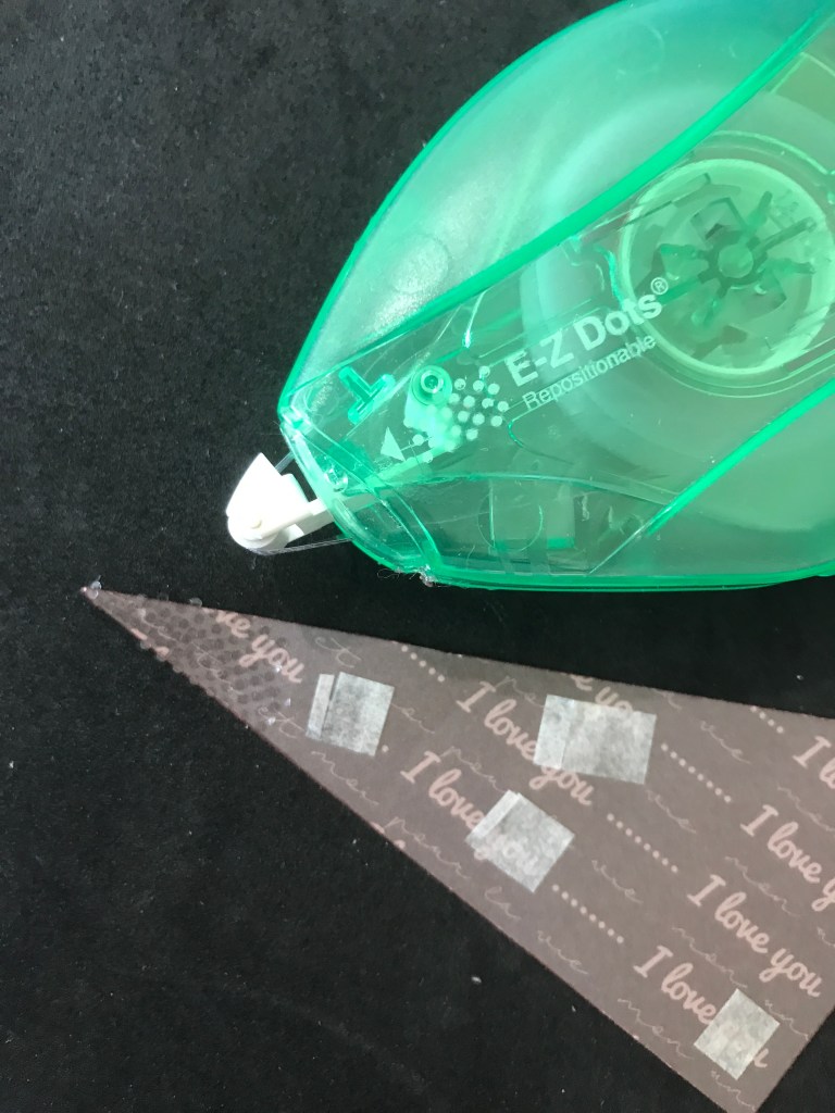 When working with these triangles remember to use your Dots tape, it is perfect to get right to the points. If you have the stamping block, do this on the foam backing of the stamp block as the dots that do not go onto the paper will not stick to it. Remember if you do have any extra on your page, just rub them off with your finger (making sure your finger is clean first!!)