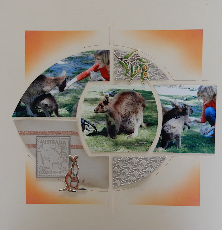 On this page Hilary has used the Australian Kangaroo embossing folder and complimented it with the older Kangaroo ‘Postage stamp’ stamp and the newer Kangaroo stamp and die set.