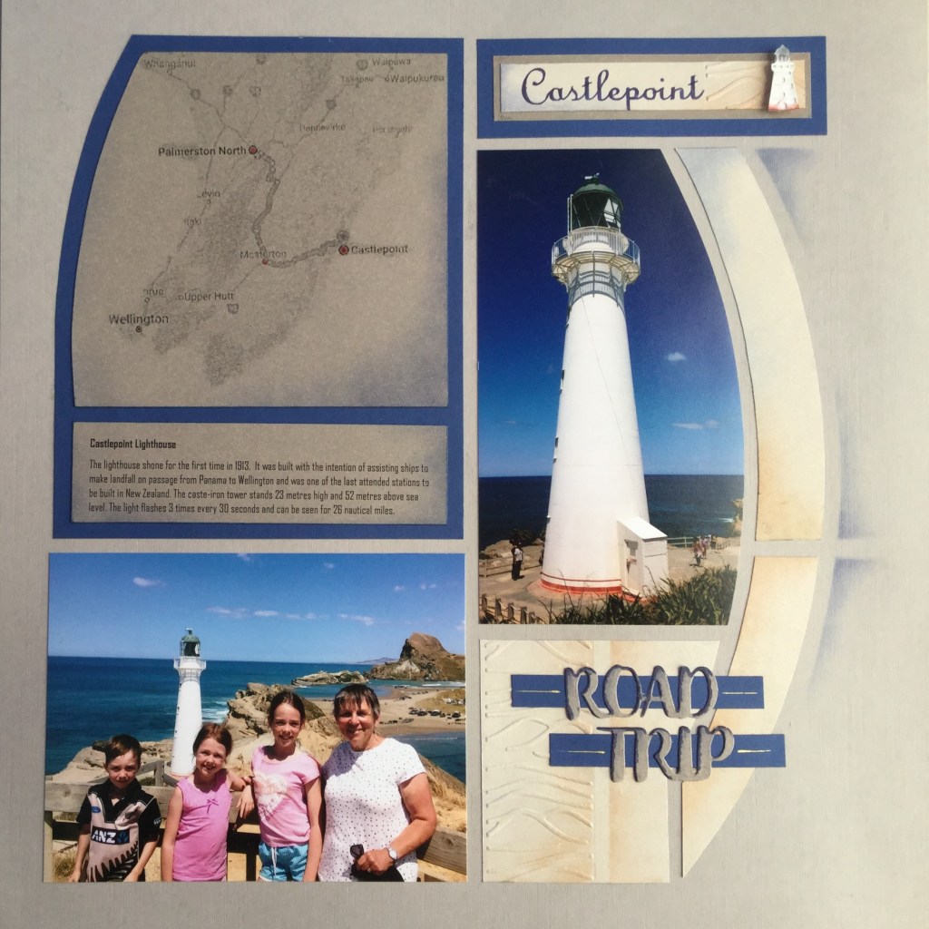 Ros has created the page above with the AZZA Nairobi stencil. She has used the Sand Dunes embossing folder I showed you earlier, the Road trip die and a lovely little Lighthouse figurine.