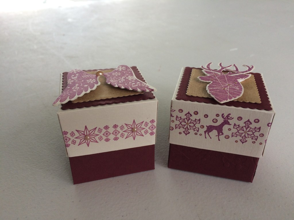I had my first Christmas celebration over the weekend and made these little gift boxes for the table. I used the Carry bag die above and the new Cushion die. All the decoration dies are available in the shop.