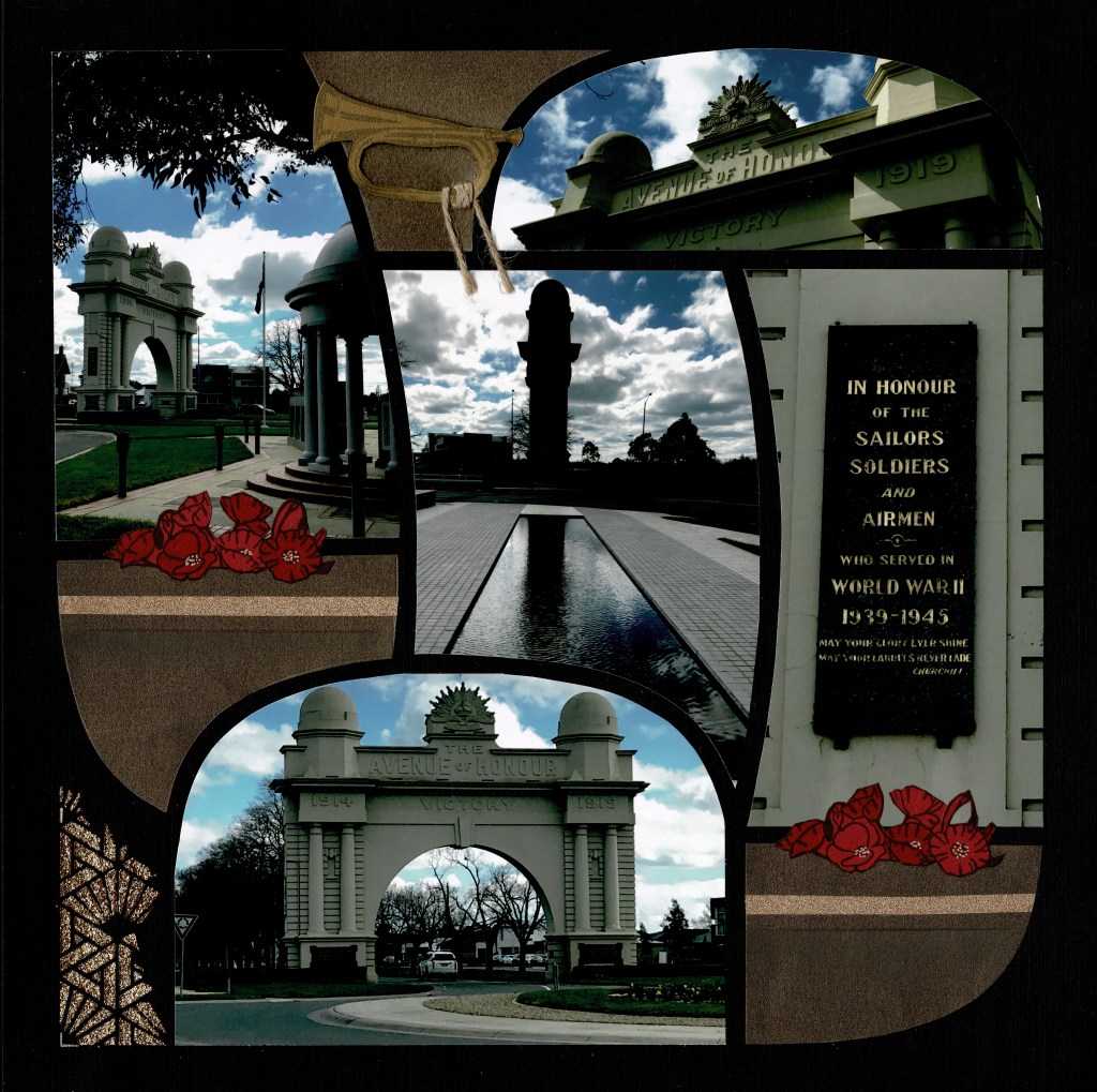 On the page above I have used the Poppy and Bugle stamp on the page, both stamped and then cut out. I completed my page with a little gold Glitter tape and Glitter paste through the new Rising Sun texture stencil to pick up the gold in the inscription on the photo.