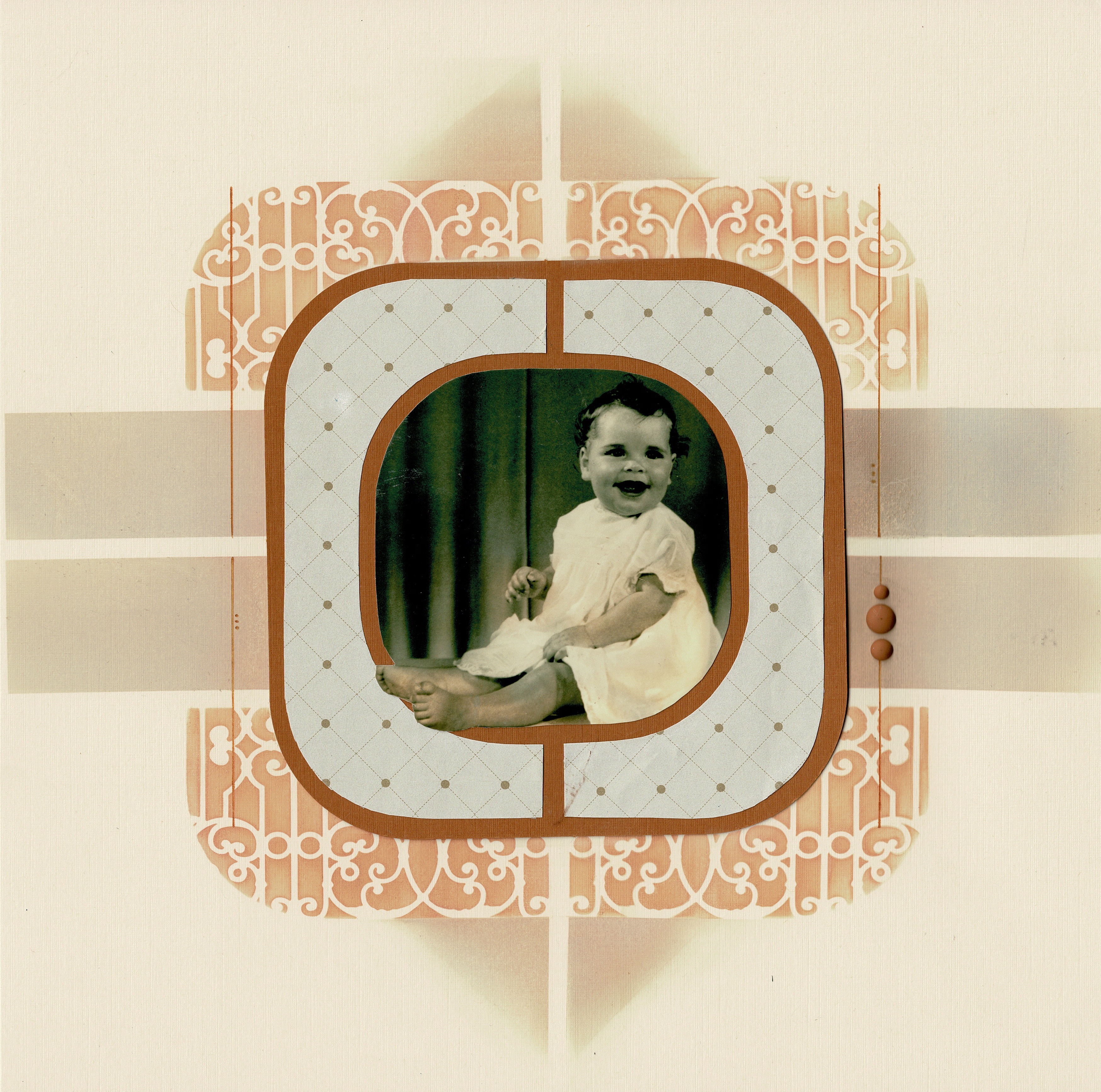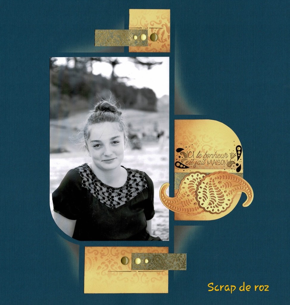 Let’s begin with the single photo. Below Scrap de Ros has used the Cashmere texture stencil on her paper, Washi tape, small elements from the sticker sheet and of course two colours of the Resin dots. She has used the Cashmere dies, placing the ‘frilly’ paisley design onto the solid one.