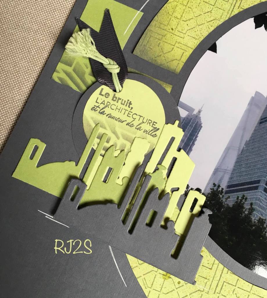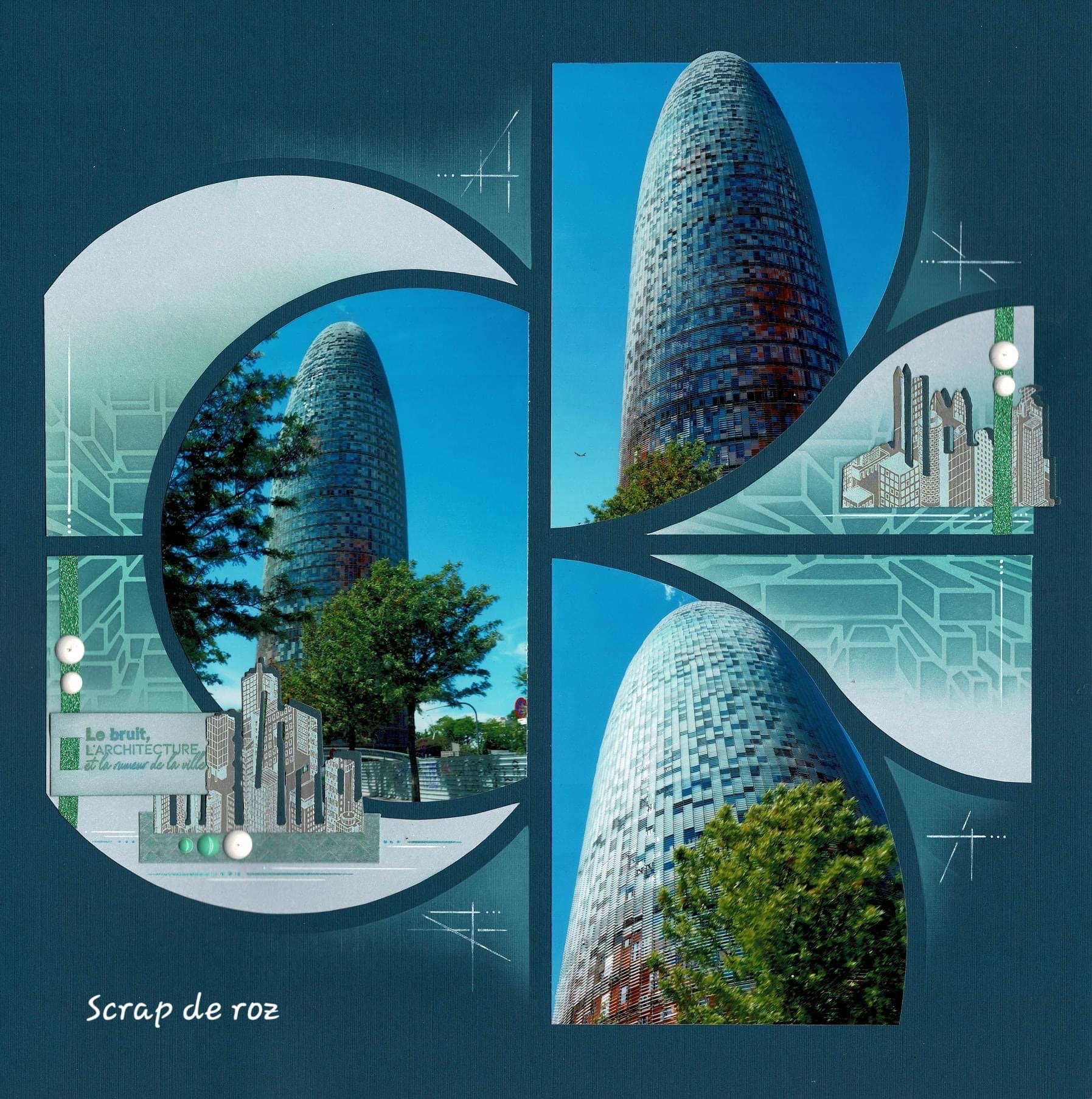 My next page was also created with two of the Barcelona stencils and the lovely Architecture die that was released with them. It can be decorated in so many ways. I chose a little of the AZZA grey Satin ribbon and a few of the AZZA circle stickers on the page. The Architecture paper also went well with my page.