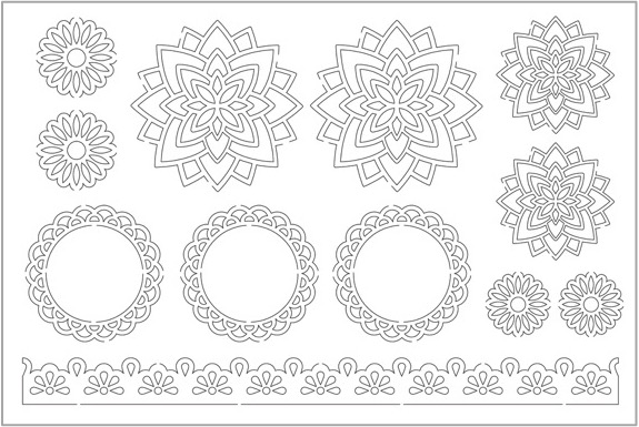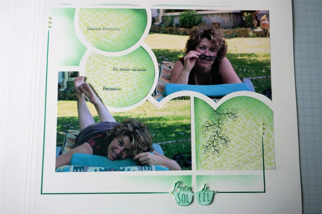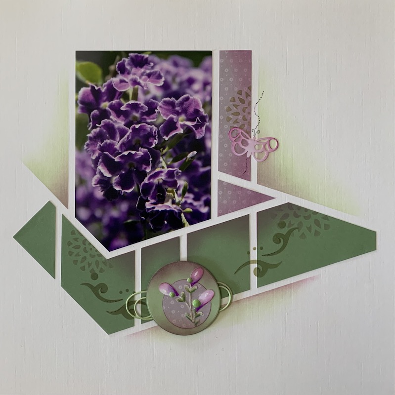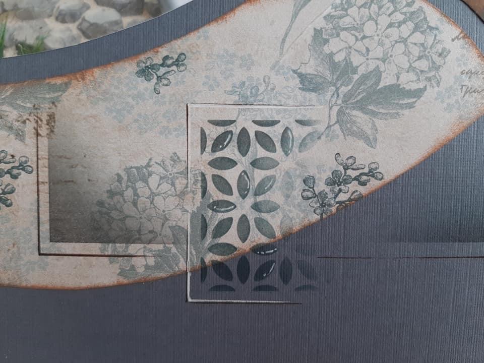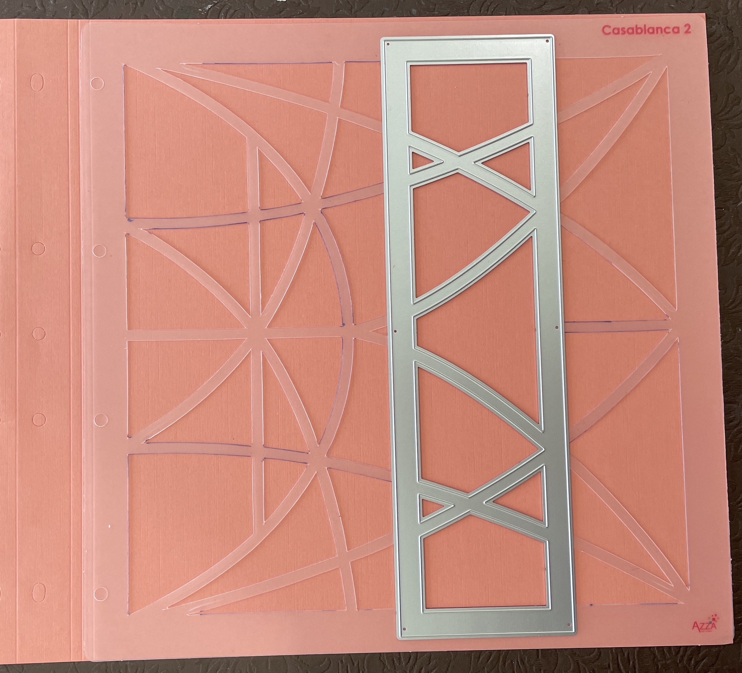 June Mail out was all about the Relax dies. Ladies received one of the dies and a lesson with ideas on how to use it on the page. Below, a page using the Relax die and the AZZA Kyoto stencil. The dies are perfect for giving your paper shape some character as they are ‘window’ dies.