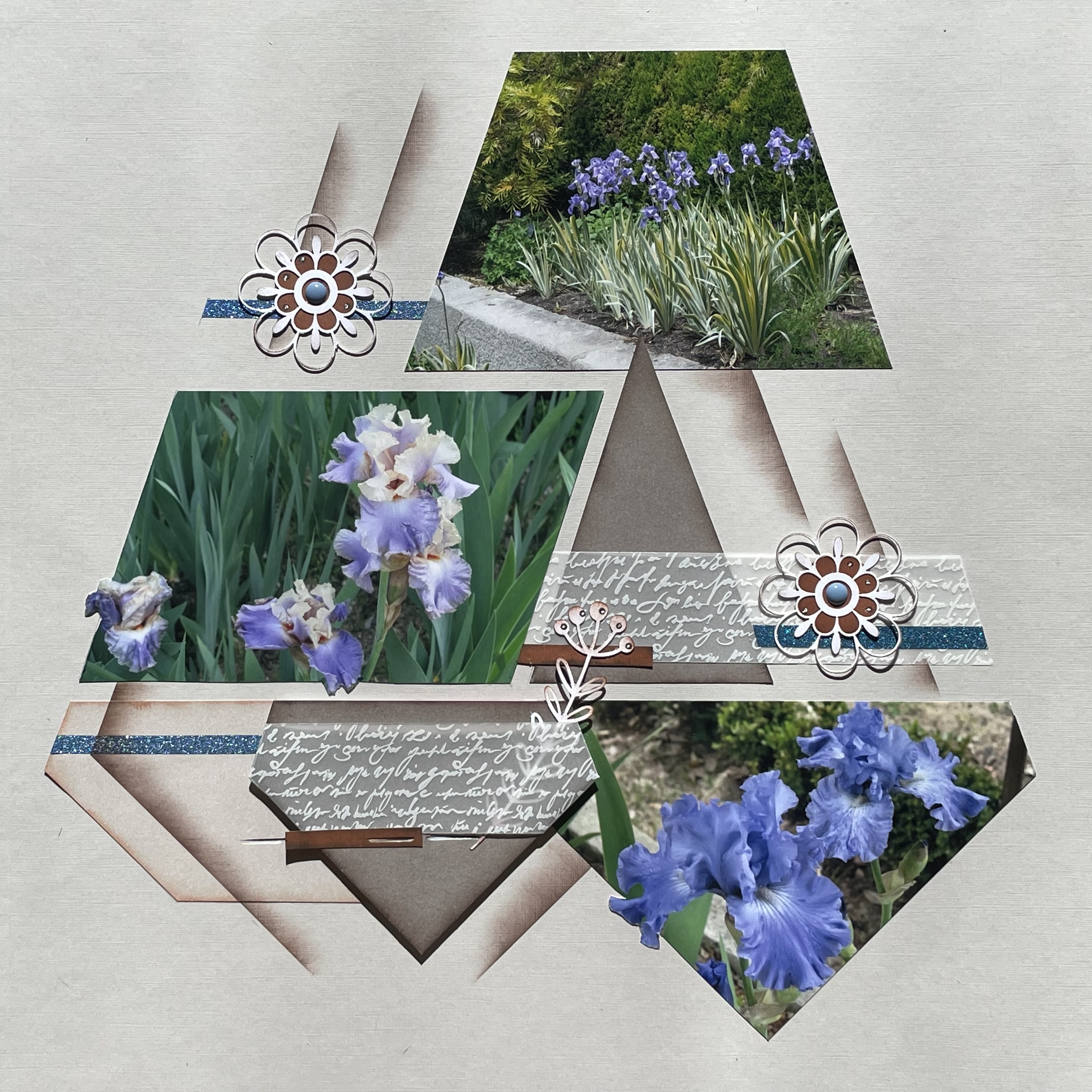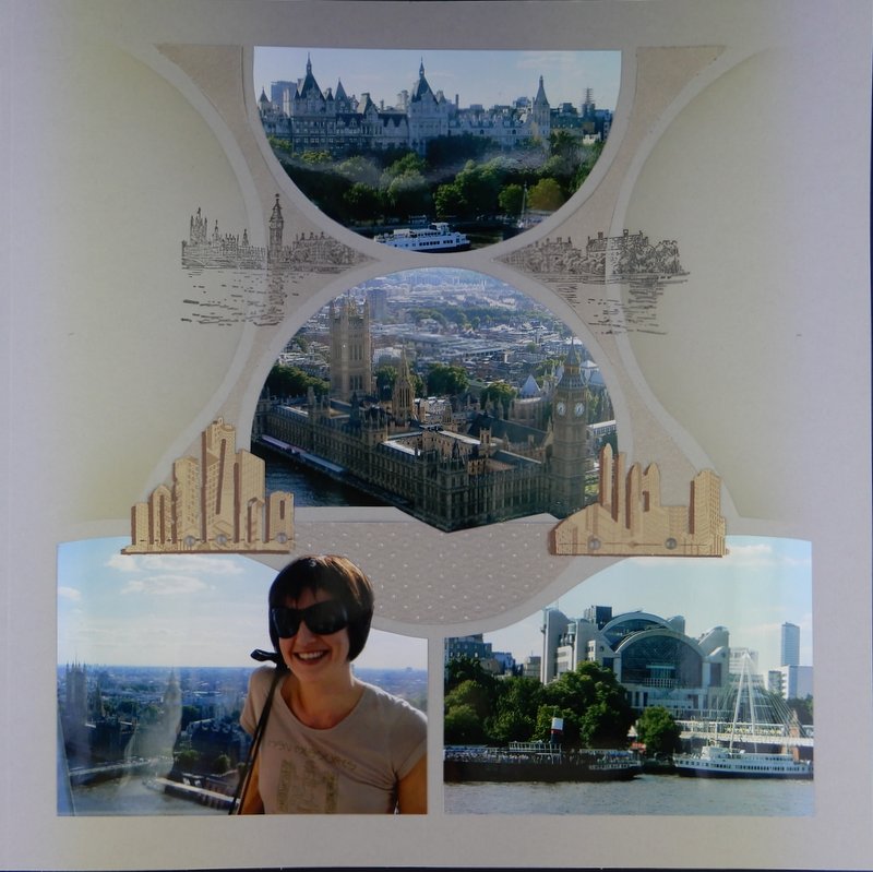 Lastly a few layouts I wanted to share using various stencils from last year and before. I liked this very simple layout using the Barcelona stencil and Cashmere paper. If you have two photos you don’t want to cut down too much this is a great layout. The photos have been mounted on card cut with the set of dies that matches the stencil. This layout will look fine if you don’t have the die as there will be the 5mm gap left by the stencil.