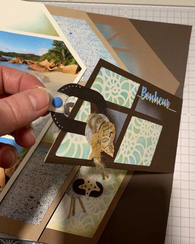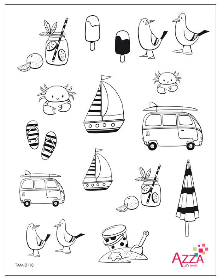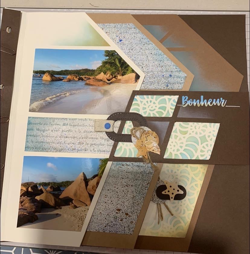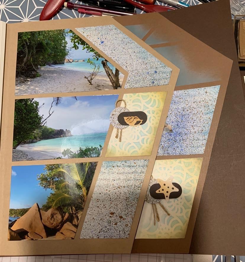 Products used for decoration are from the AZZA On the Beach theme. The texture stencil is beautiful on the page.