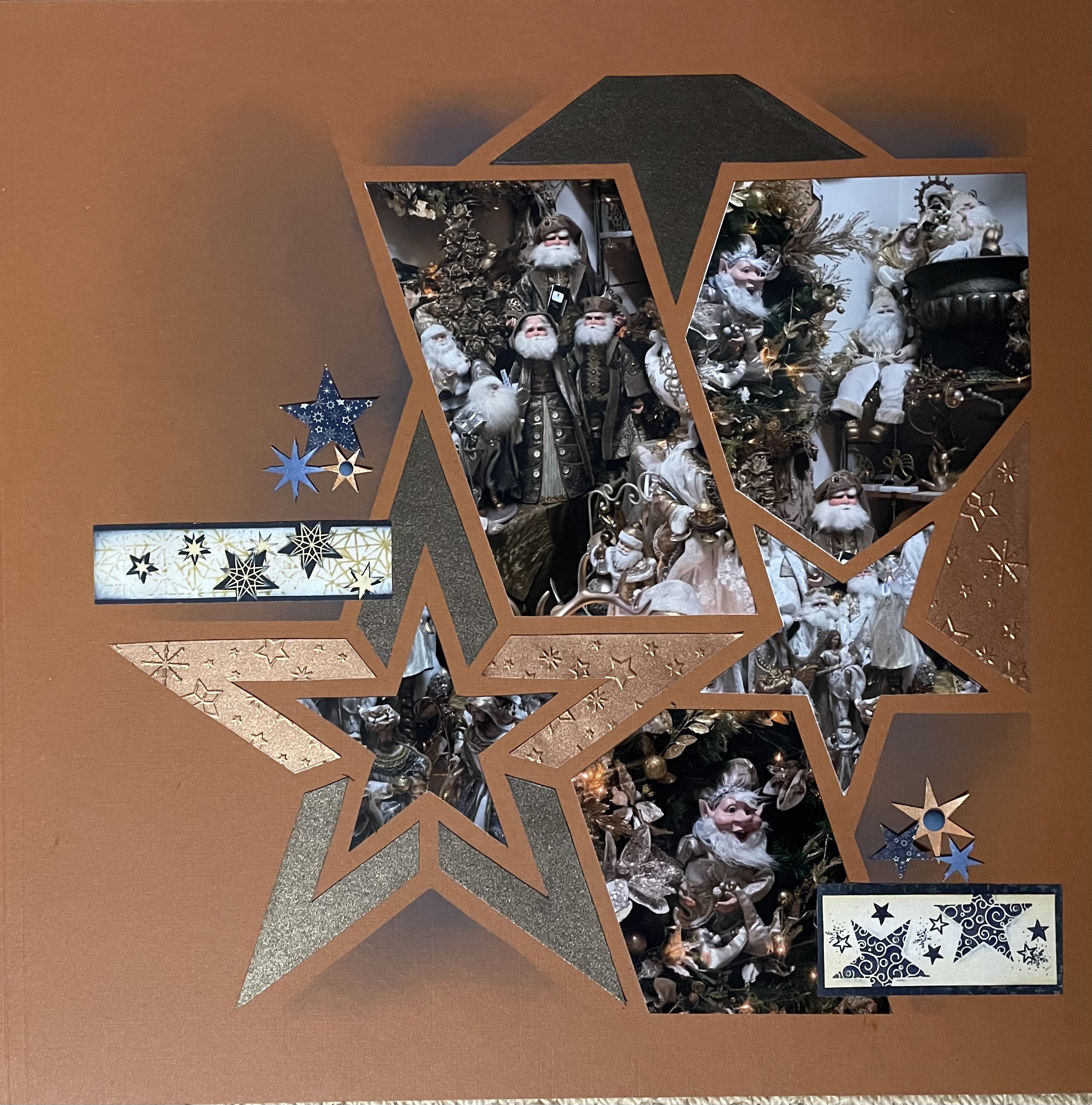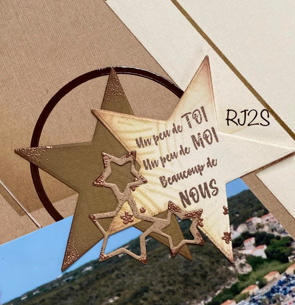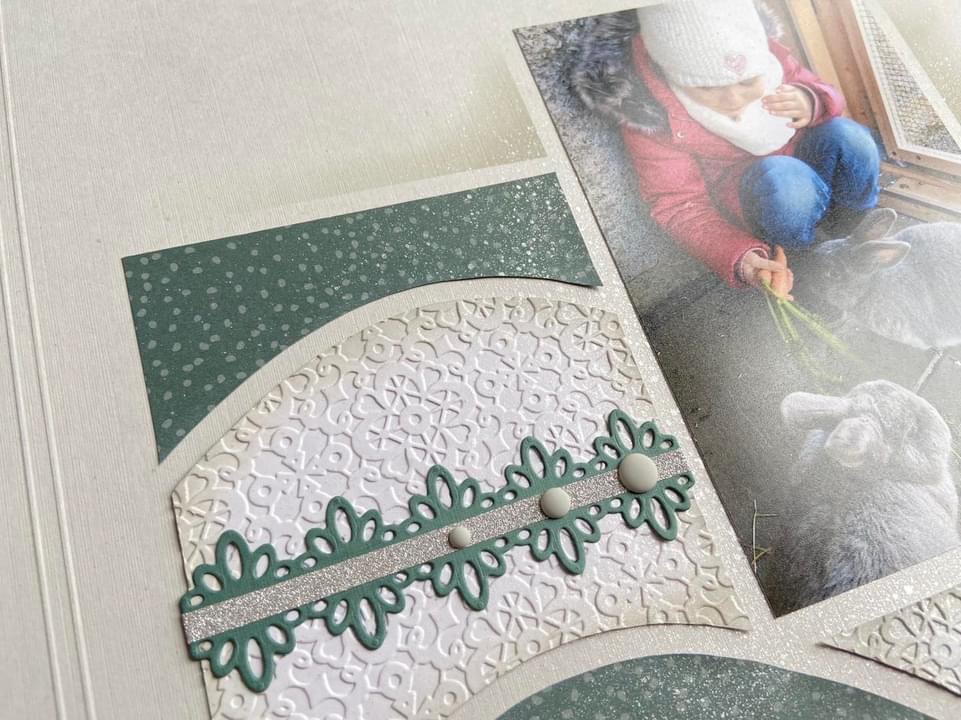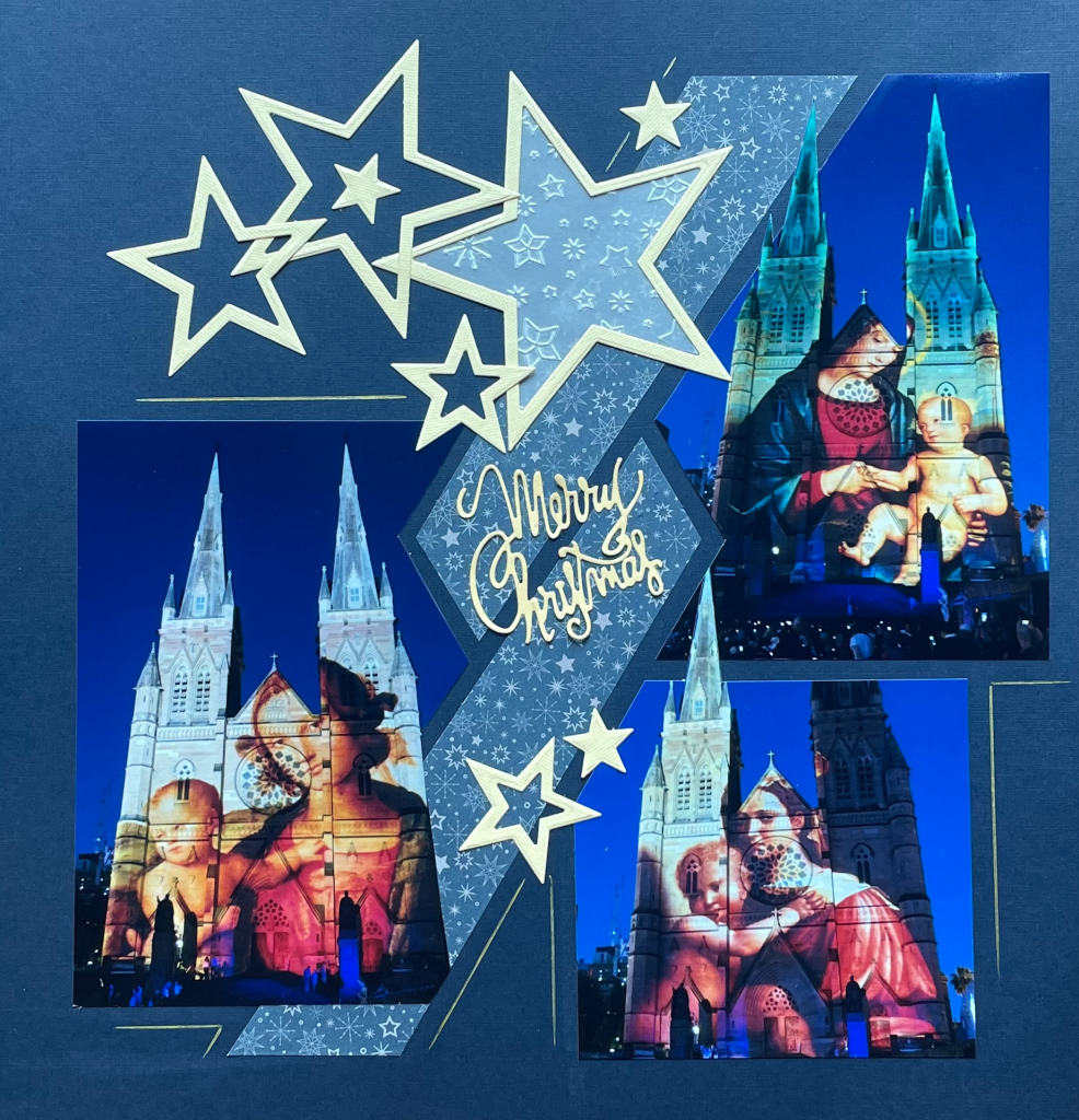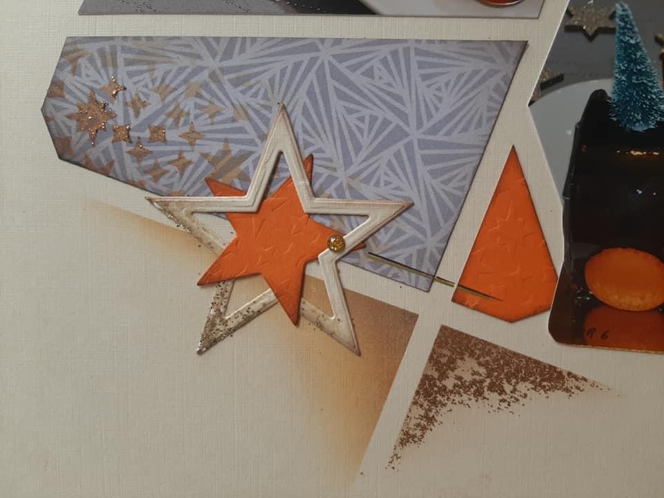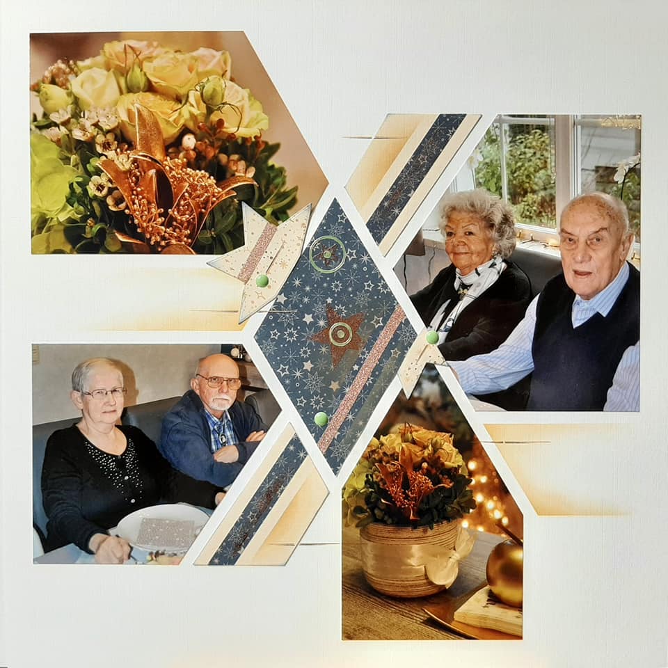 I also liked this page by Adeline Close, using only one photo. Adeline has used the Celestial stencil for her layout as it pairs so well with the stars. She has used the Starry night embossing folder. Do look at the Starry night products in the online shop as some are still available and on sale this week. I also love the look of the Vellum used on the page, cut with the Star nesting dies.