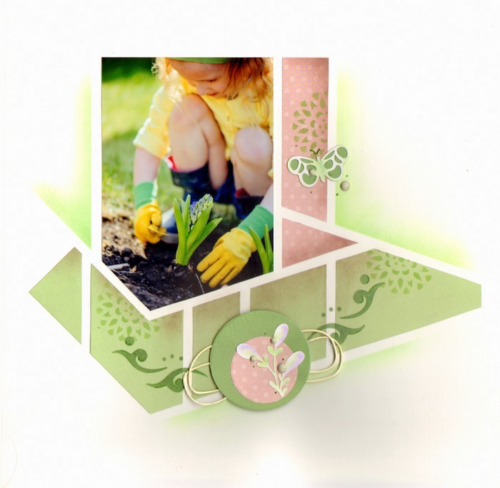 Or you can use one stencil on half your page and keep your photos almost uncut on the other half as Christine Houbrechts has shown on the page below.