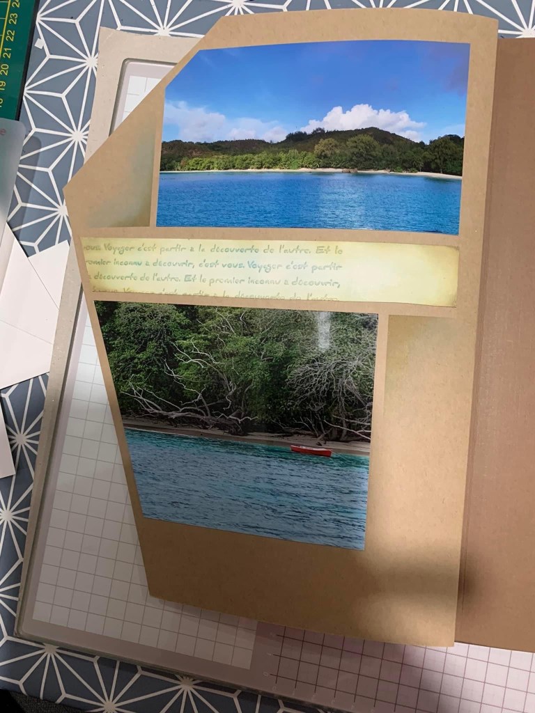 Christine Ronsin shows how the stamped image of the yacht together with the Alpes Maritimes texture stencil go together to create a little scene on the page. This shape is perfect for a title to a page as seen below.