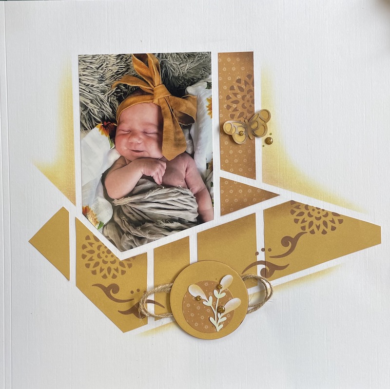These two layouts are using the Barcelona stencil set. Above the AZZA Birth cutting die has been used for the decorations too.