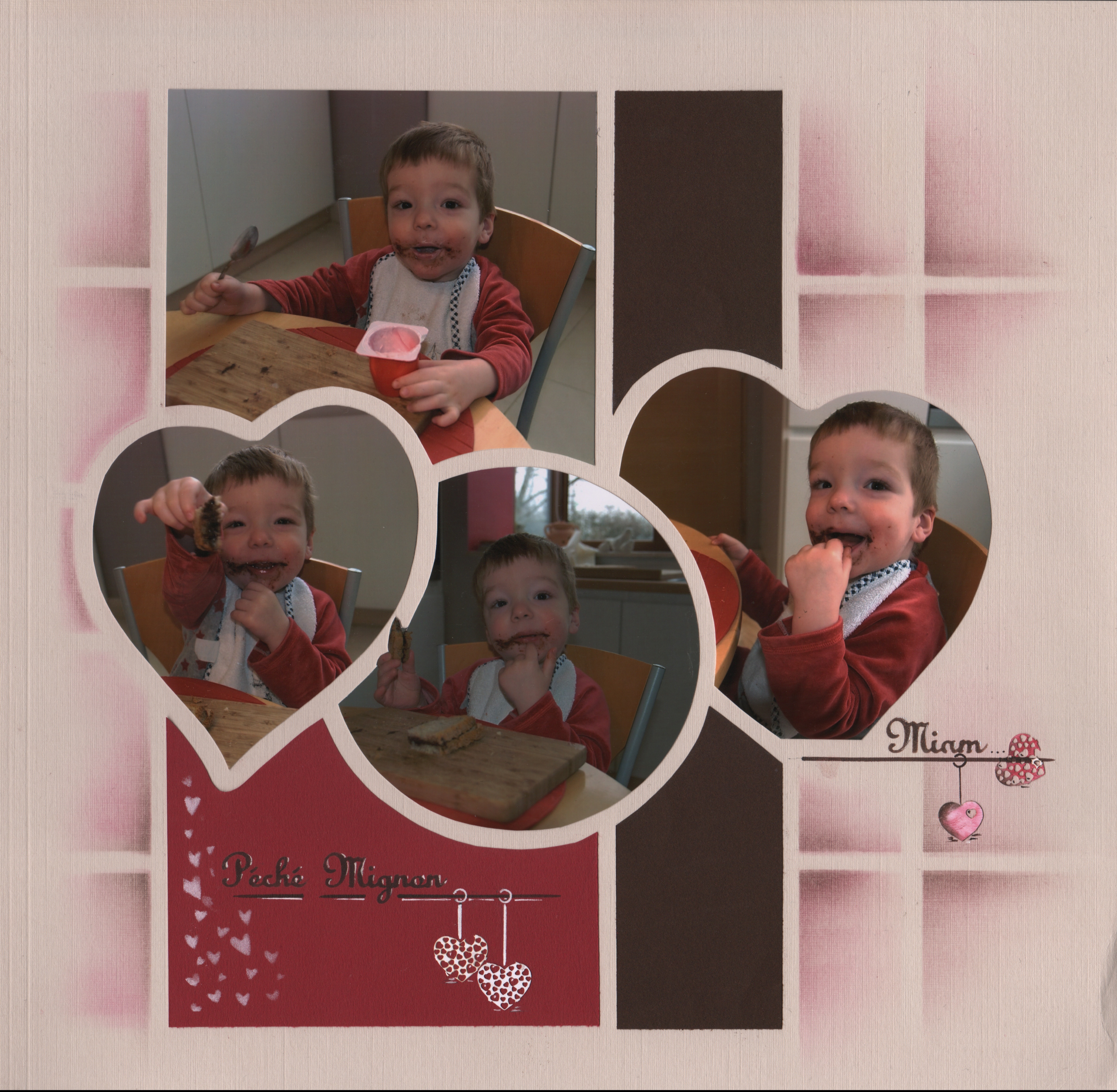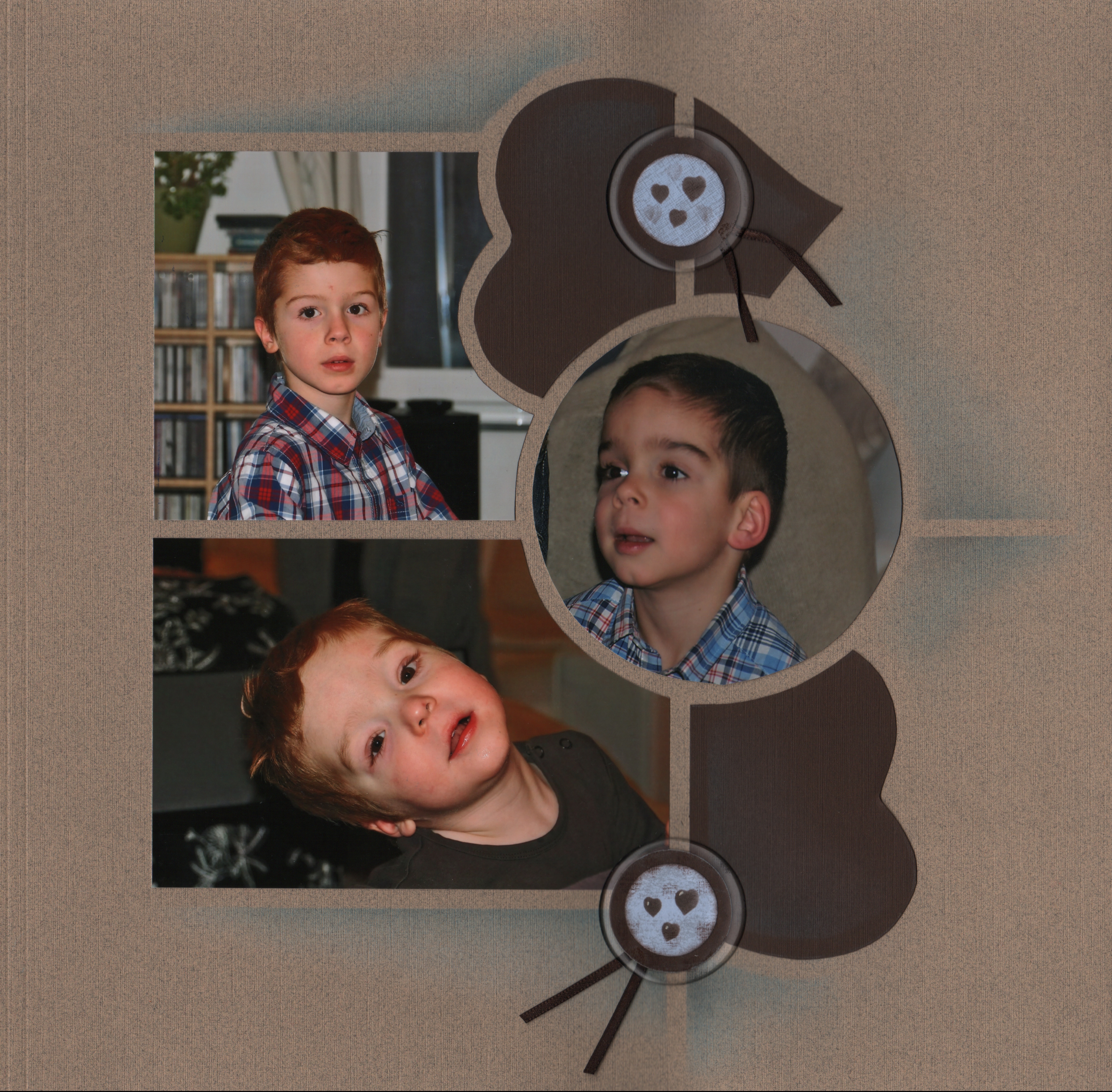 A beautiful page created by Nathlie Carbon, France. Front page with two circles cut out to show photos on page behind.