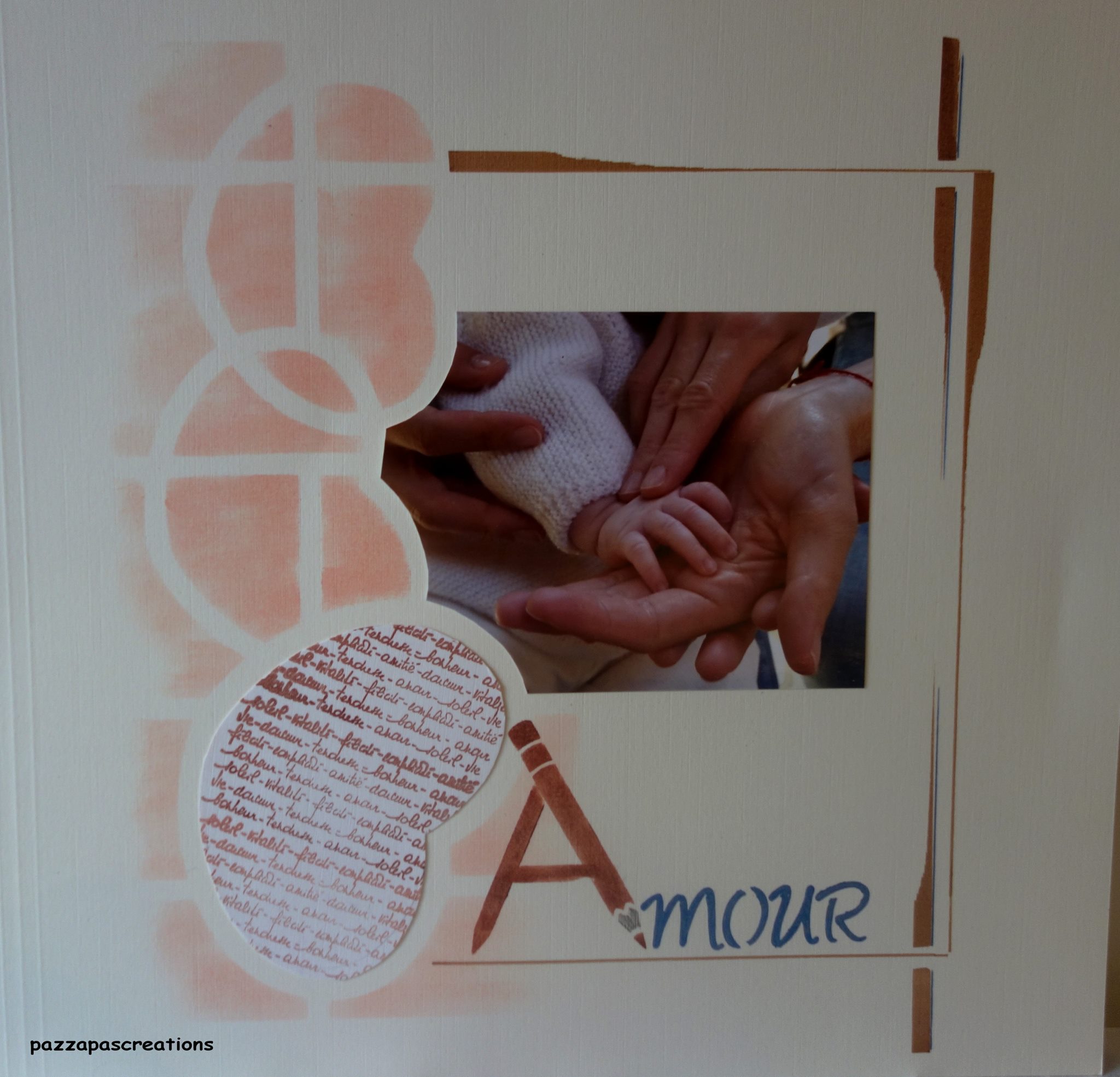 Single page, shapes highlighted with chalks. School stencil used for the “A” of Amour.